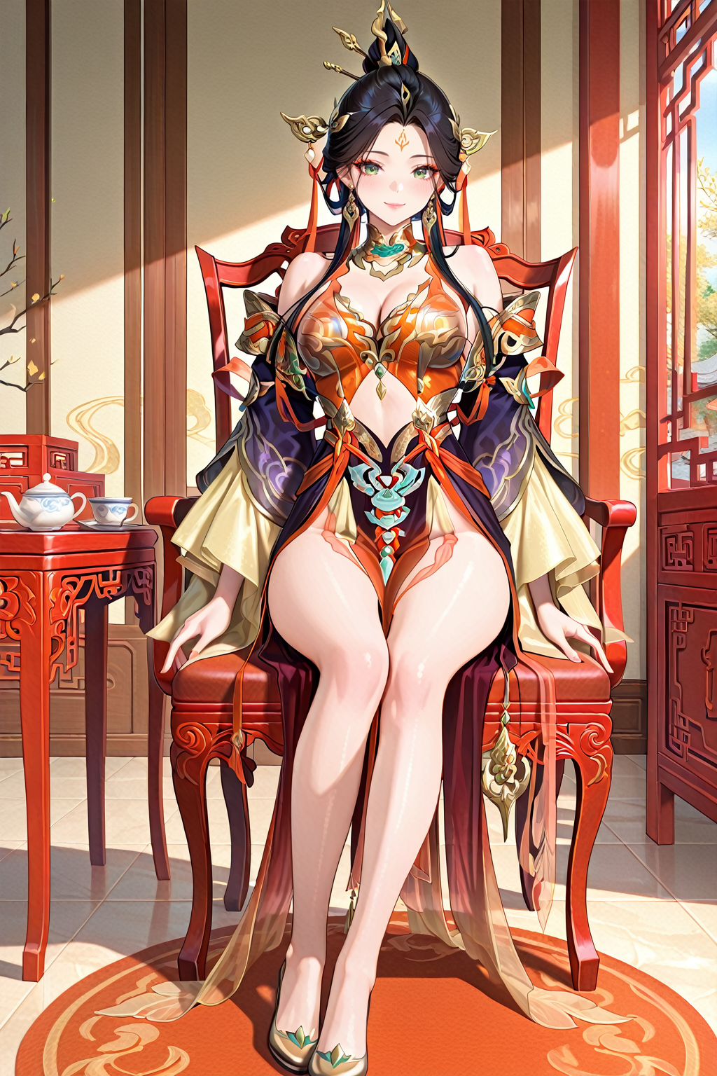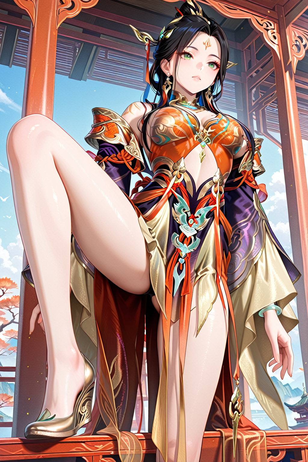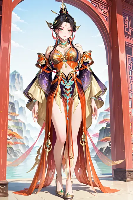 1. 13878w hair0,black hair,earrings,forehead mark,hair ornament,long hair,hair stick,green eyes,