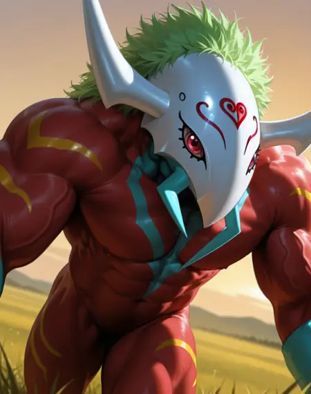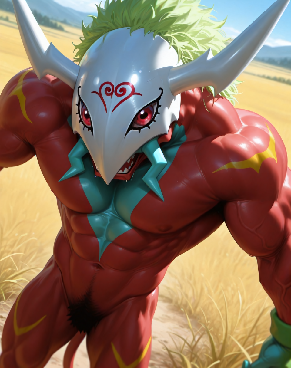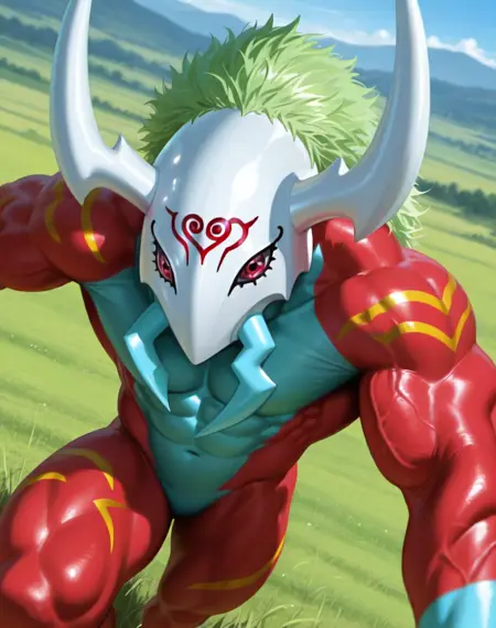 Prompts for this lora are ( Sethmon, muscular, Digimon, ). It helps make the picture by adding the prompts ( red body, white beaked helmet, white head, white horns, green hair, ) or similar due to some checkpoints giving the wrong color or look at times.