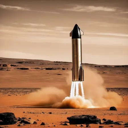 Medium shot of A shiny silver Starship idle on the surface of Mars with landing legs, background Mars rovers, high tech, orange Martian night time landscape, (photorealistic:1.3), dusty, mountain range, science fiction, hyperrealism, brown sky, (pointy shiny silver rockets):0.8, red and white mushrooms dotting the terrain, Extremely high-resolution details, photographic, crisp, fine texture, incredibly lifelike <lora:snowmountxl_v1:1> <lora:Starship:1>