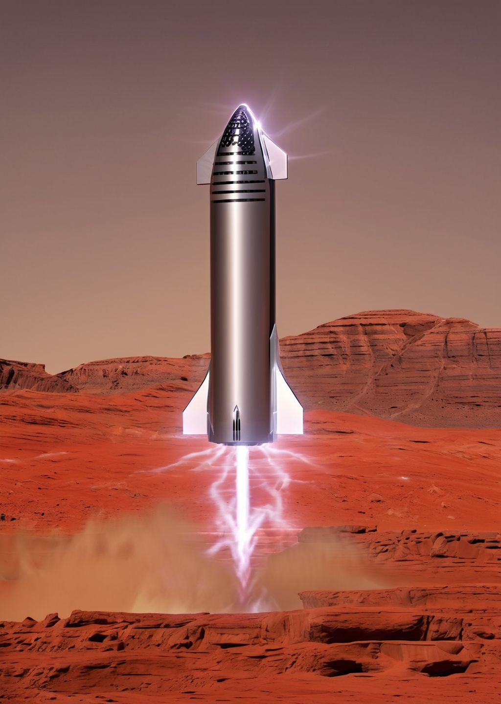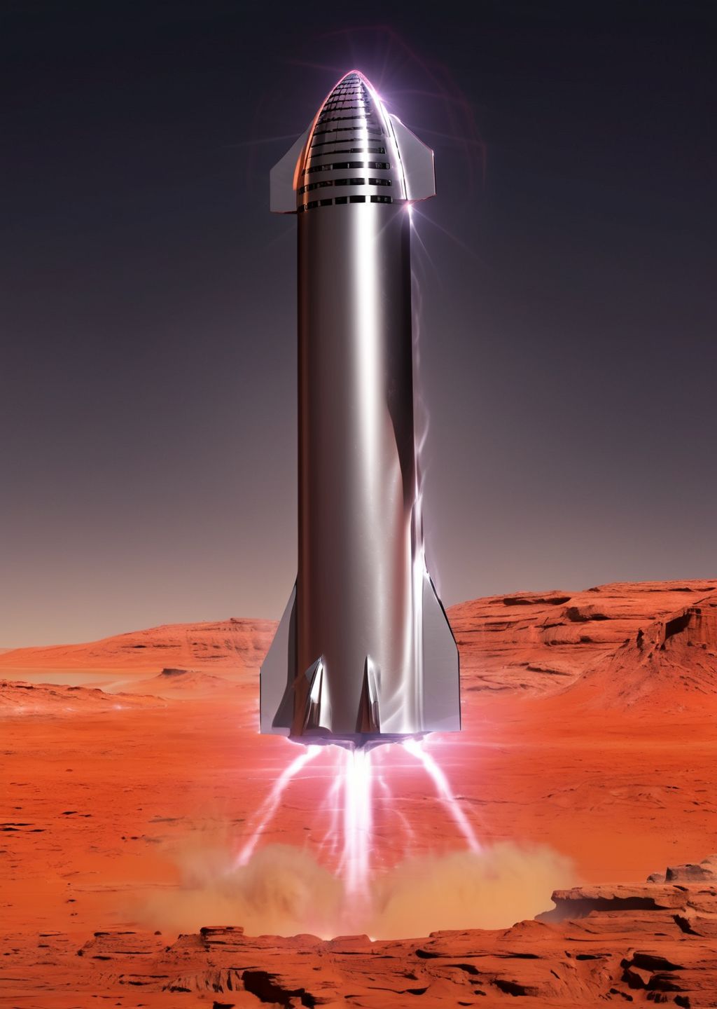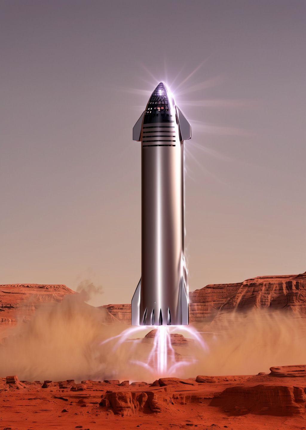 Medium shot of A shiny silver Starship idle on the surface of Mars with landing legs, background Mars rovers, high tech, orange Martian night time landscape, (photorealistic:1.3), dusty, mountain range, science fiction, hyperrealism, brown sky, (pointy shiny silver rockets):0.8, red and white mushrooms dotting the terrain, Extremely high-resolution details, photographic, crisp, fine texture, incredibly lifelike <lora:snowmountxl_v1:1> <lora:Starship:1>