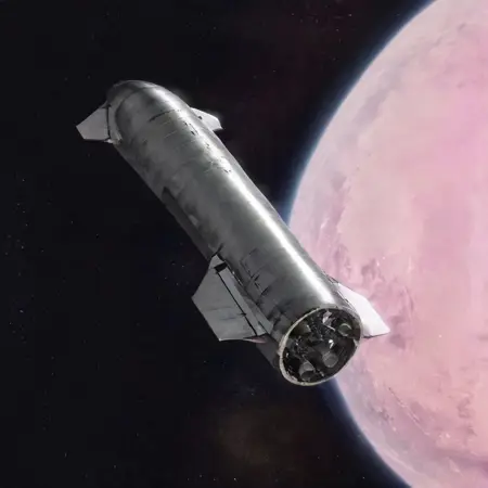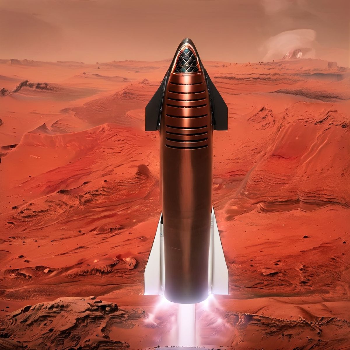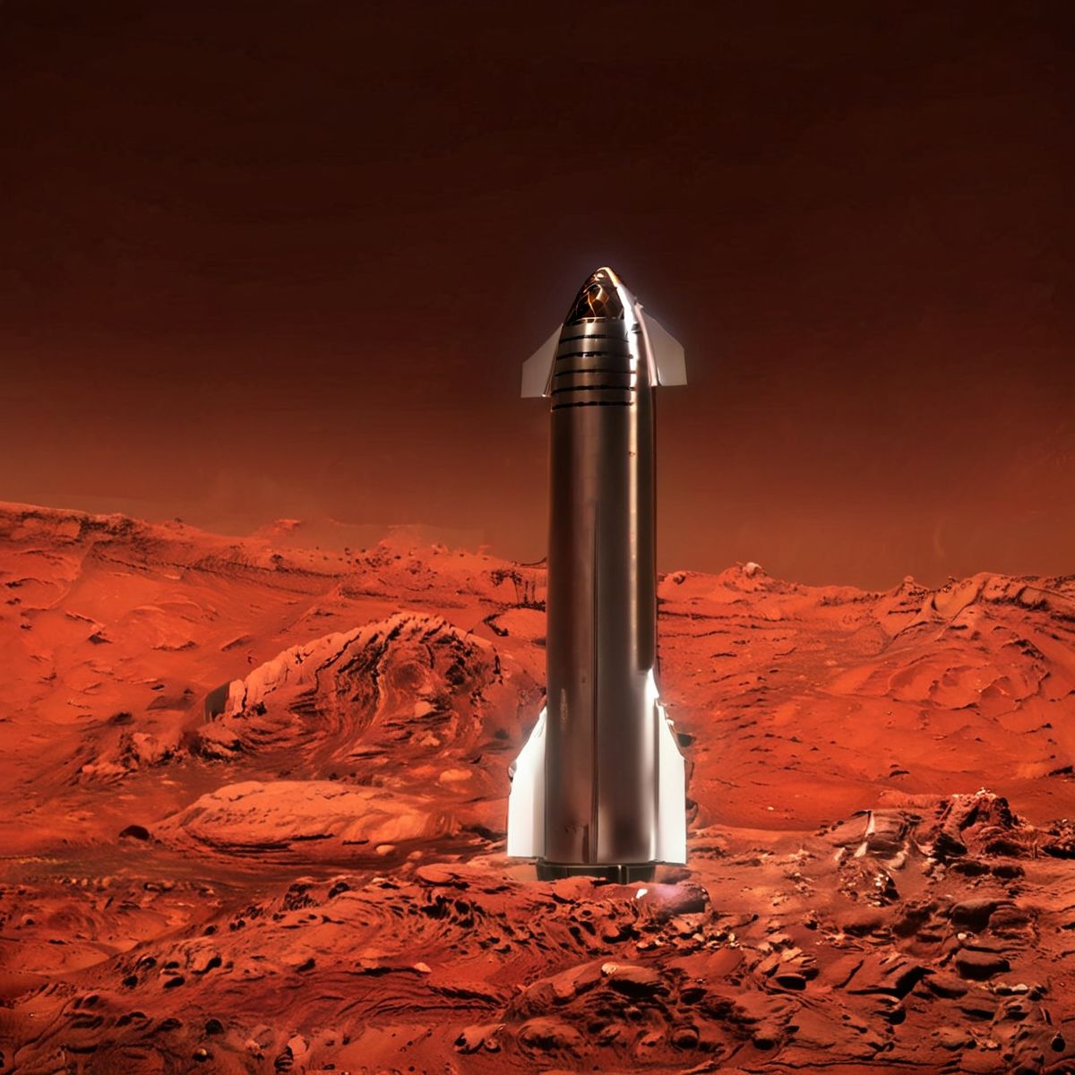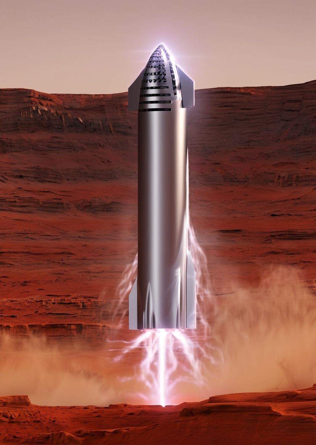 Medium shot of A shiny silver Starship idle on the surface of Mars with landing legs, background Mars rovers, high tech, orange Martian night time landscape, (photorealistic:1.3), dusty, mountain range, science fiction, hyperrealism, brown sky, (pointy shiny silver rockets):0.8, red and white mushrooms dotting the terrain, Extremely high-resolution details, photographic, crisp, fine texture, incredibly lifelike <lora:snowmountxl_v1:1> <lora:Starship:1>
