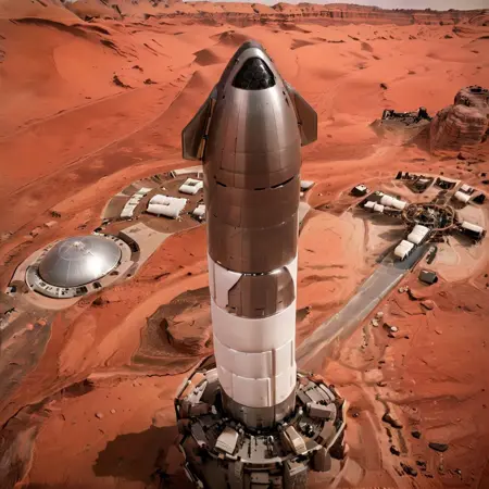 中景:一艘闪亮的银色星舰静止在火星表面,配有着陆腿,背景为火星车,高科技感,橙色的火星夜间景观,(写实风格:1.3),布满尘土,山脉轮廓,科幻,超现实主义,棕色天空,(尖头闪亮银色火箭):0.8,地形上点缀着红白蘑菇,极高分辨率细节,摄影级,清晰,精细纹理,极其逼真 <lora:snowmountxl_v1:1> <lora:Starship:1>