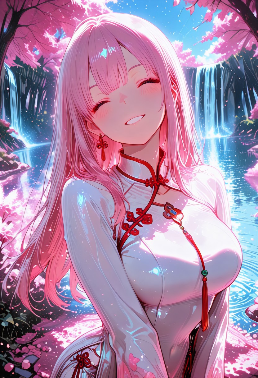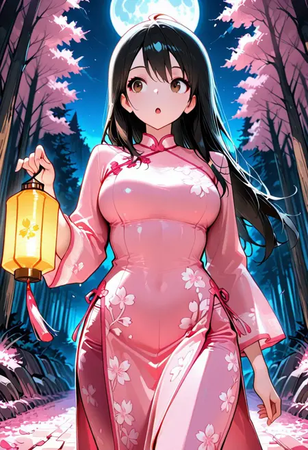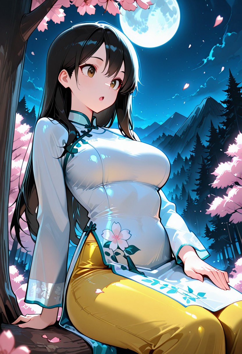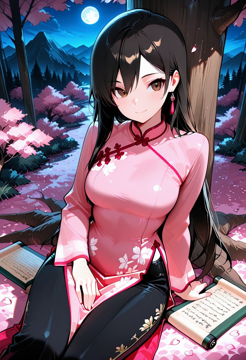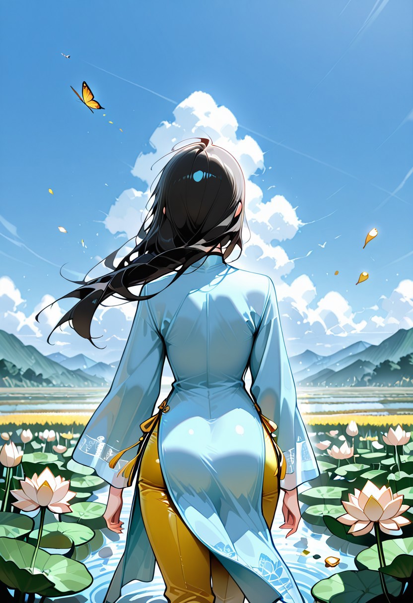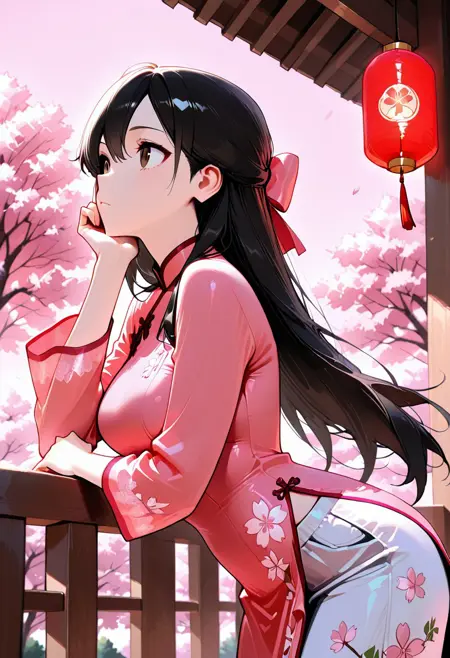 tags ex:1girl, solo, black hair, long hair, medium breasts, perfect brown eyes, Vietnamese Girl, Vietnamese clothing, pink flower print Ao Dai dress, white silk pants, looking afar, head rest, purple back hair bow balcony above the pink cherry blossom tree canopy, pale pink sky,outdoors