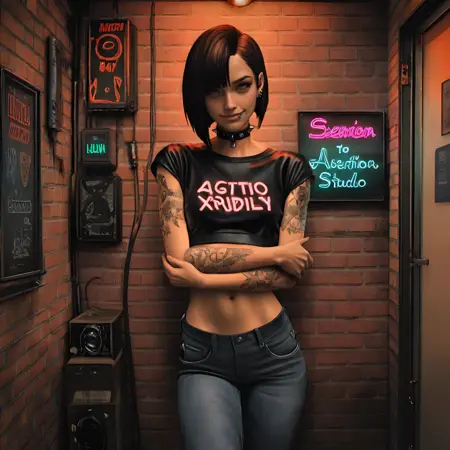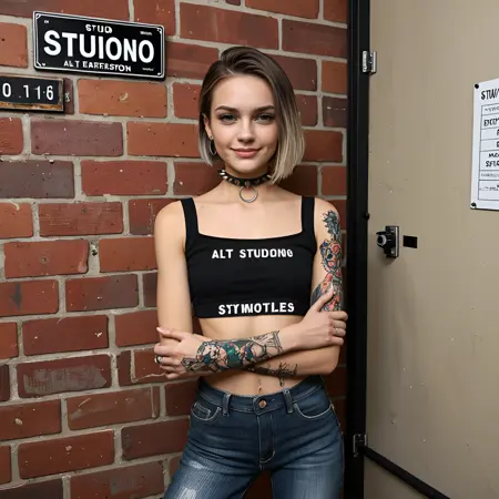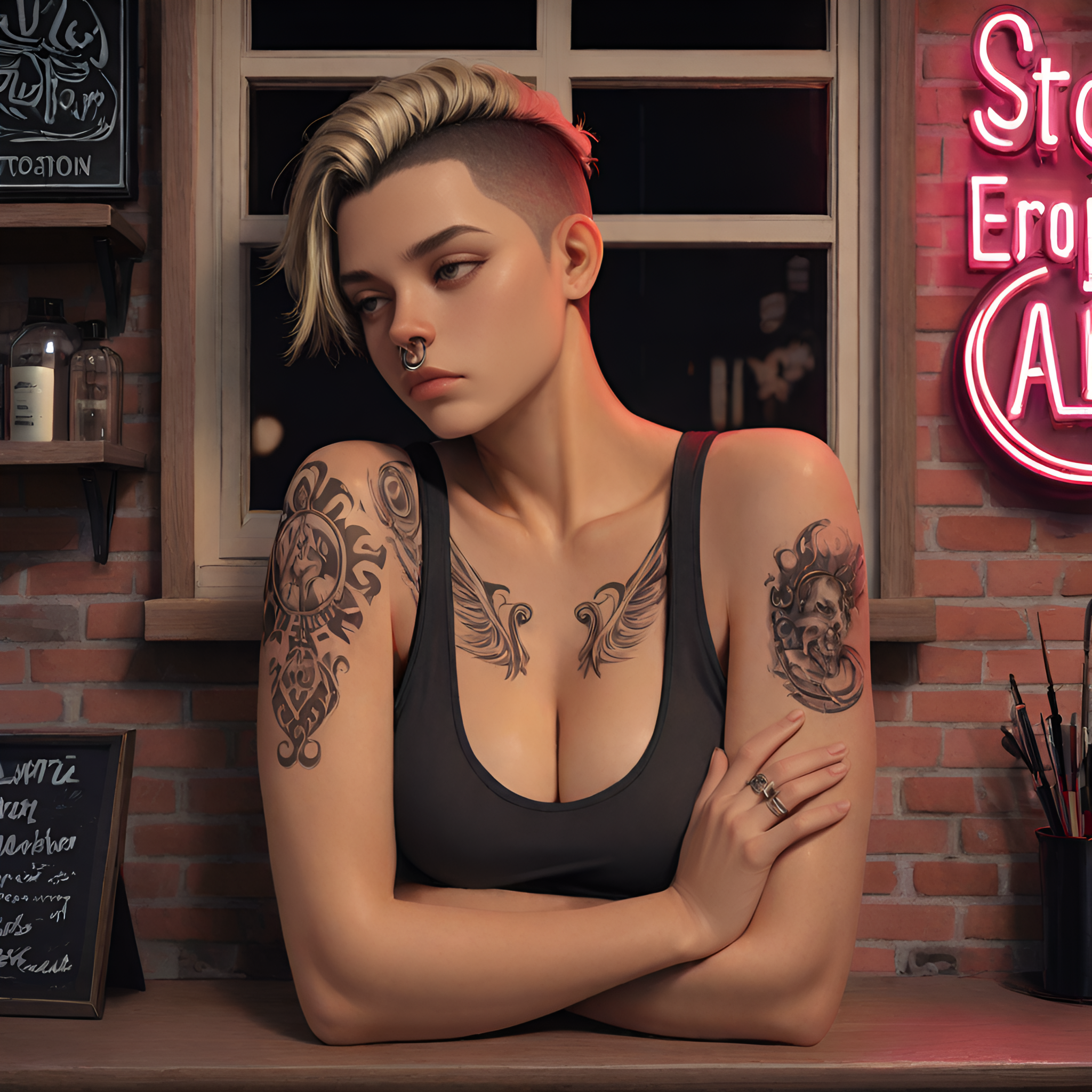 Built for SDXL workflows, this pack focuses on low-cut tanks and band tees with cleavage, chest and sleeve tattoos, piercings, combat boots, neon tattoo signs, brick walls, and sticker-covered counters. Perfect for alt character art, shop promos, and scene-building thumbnails with a strong subculture vibe.