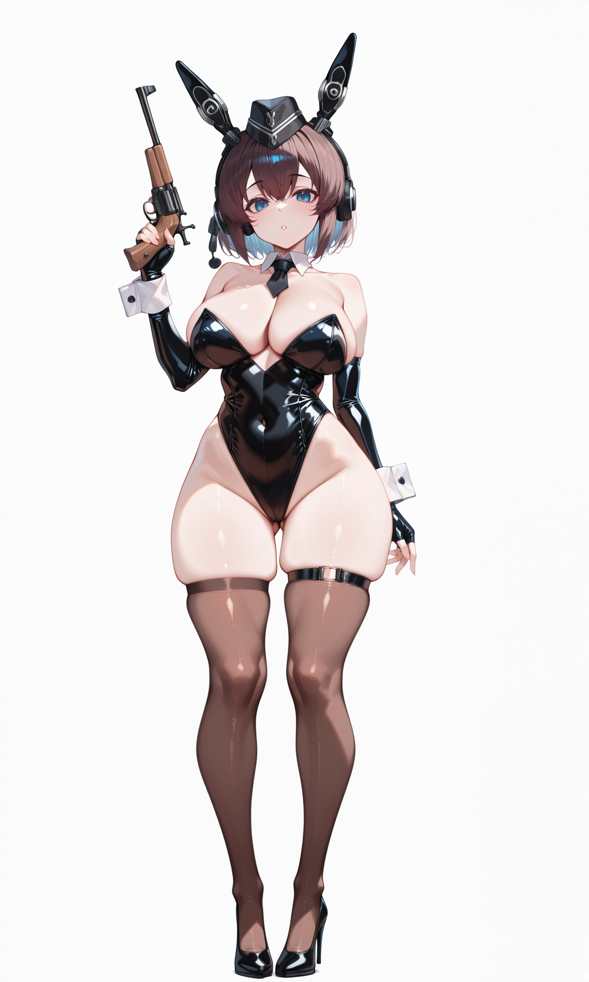 옷 태그: detached_collar, white_necktie, short_necktie, black_leotard, strapless_leotard, latex_leotard, elbow_gloves, black_gloves, fingerless_gloves, white_wrist_cuffs, black_thigh_strap, brown_thighhighs, black_high_heels,
