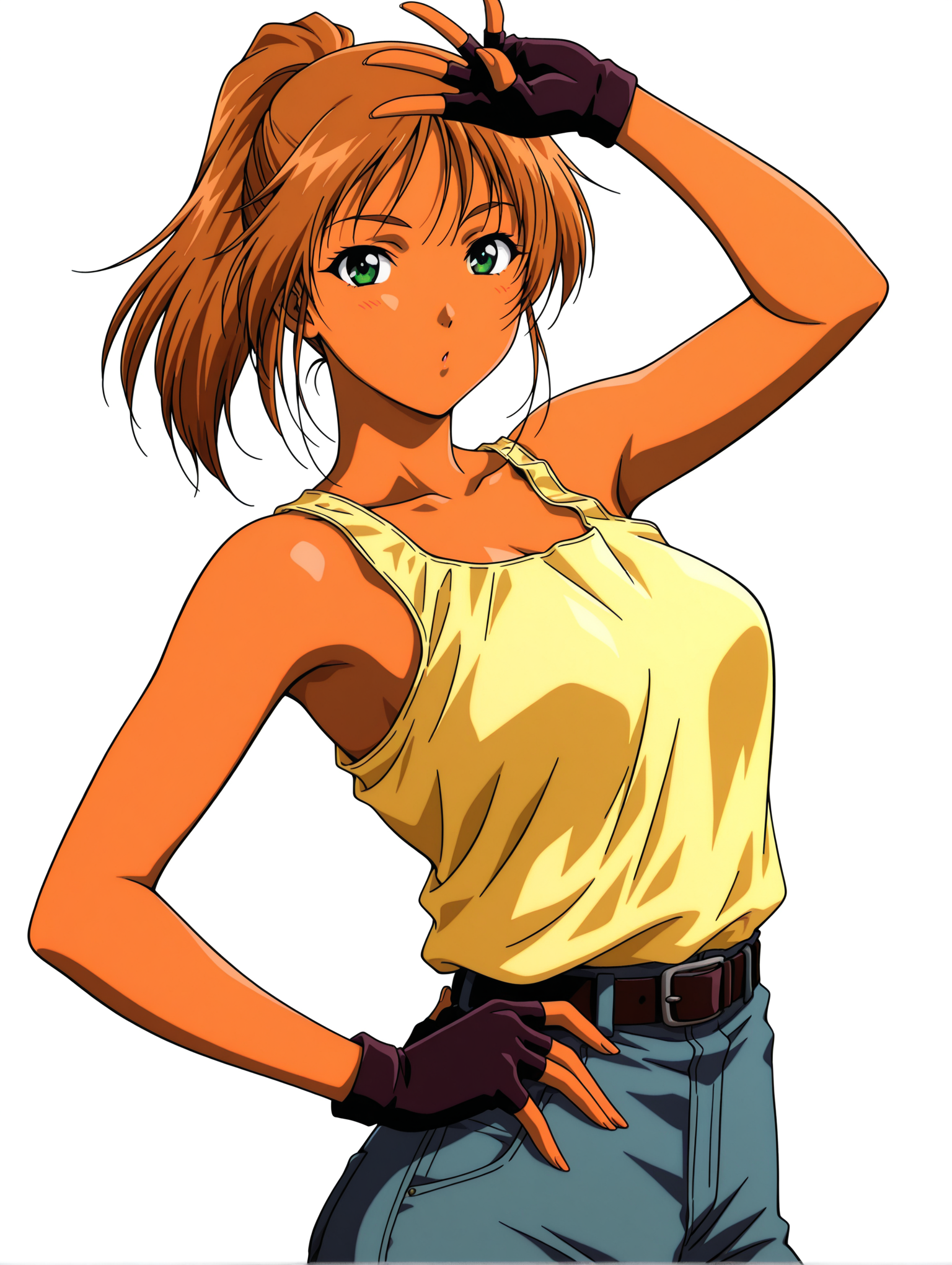 衣装 ・n_clothes,yellow tank top,fingerless gloves,belt,jeans,pants,