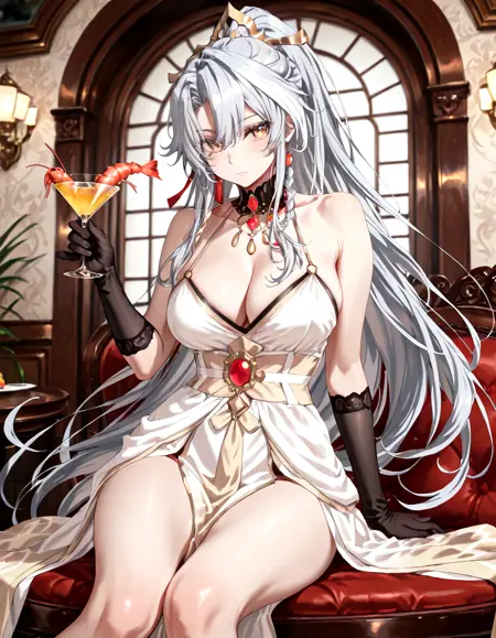 长银发,渐变发色,飘逸长发,马尾,编发,侧发,刘海,发饰,金色头饰,红色发带,黄色眼睛