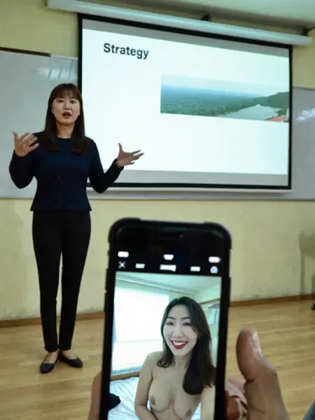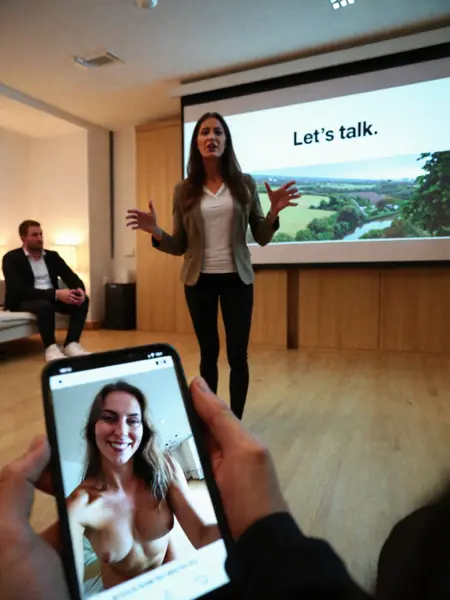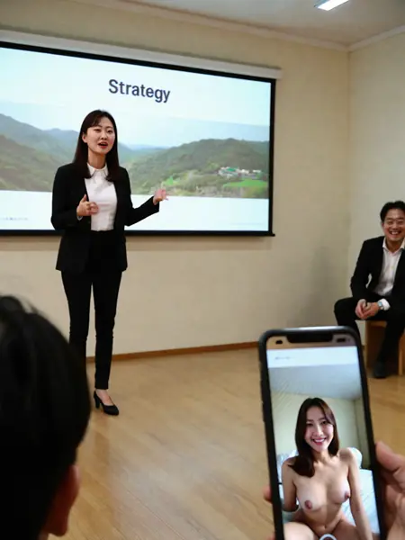 In the background is a fully clothed {korean|pakistani|dutch|nigerian|latina|} woman, shown mid-gesture and her facial expression is shown unflattering in mid-speech, presenting and in the background is a slidedeck {projected onto wall|shown on a tv screen} showing a scenic scene with the text "{Strategy|Welcome|Let's talk}". in front of the woman is a wide floorspace.