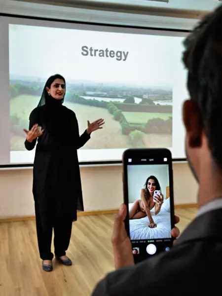 in the foreground is a man holding a phone, showing the exact same woman in a bedroom, naked and taking a mirror selfie and she has a flirtatious seductive smile {,and the man is looking back with an {amused expression|mischievous smile}|}. (the phone display is desaturated and faded with light-bleed and lcd distortions, moire patterns and glass reflections.:{1|2|3})