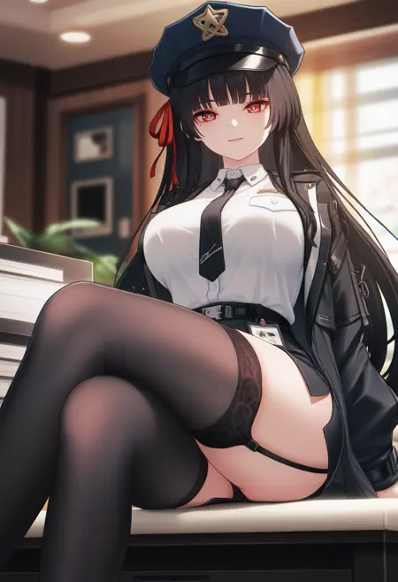 1 black choker,white sailor collar,red neckerchief,dark blue serafuku,black coat,long sleeves,open coat,black belt,high-waist skirt,dark blue skirt,pleated skirt,thigh strap