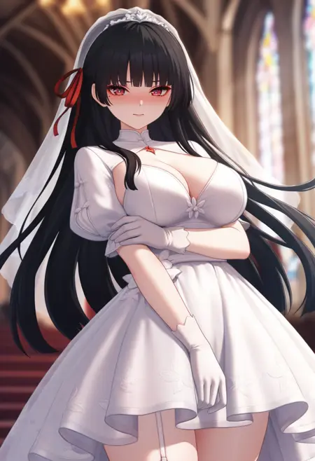 red eyes, black hair, long hair, hair ribbon, red ribbon, mole under eye