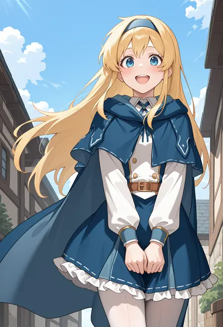 蓝色发带,蓝色短斗篷,蓝色斗篷,双排扣,有领衬衫,双色衬衫,蓝色衬衫,白色衬衫,白色袖子,长袖,棕色腰带,蓝色裙子,荷叶边裙子,白色连裤袜,