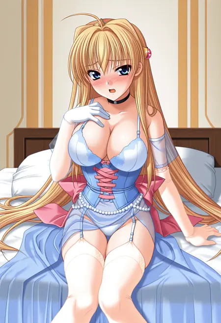 pkjjann, 2000s \(style\), blonde hair, very long hair, blue eyes, ahoge, hair ornament, large breasts,