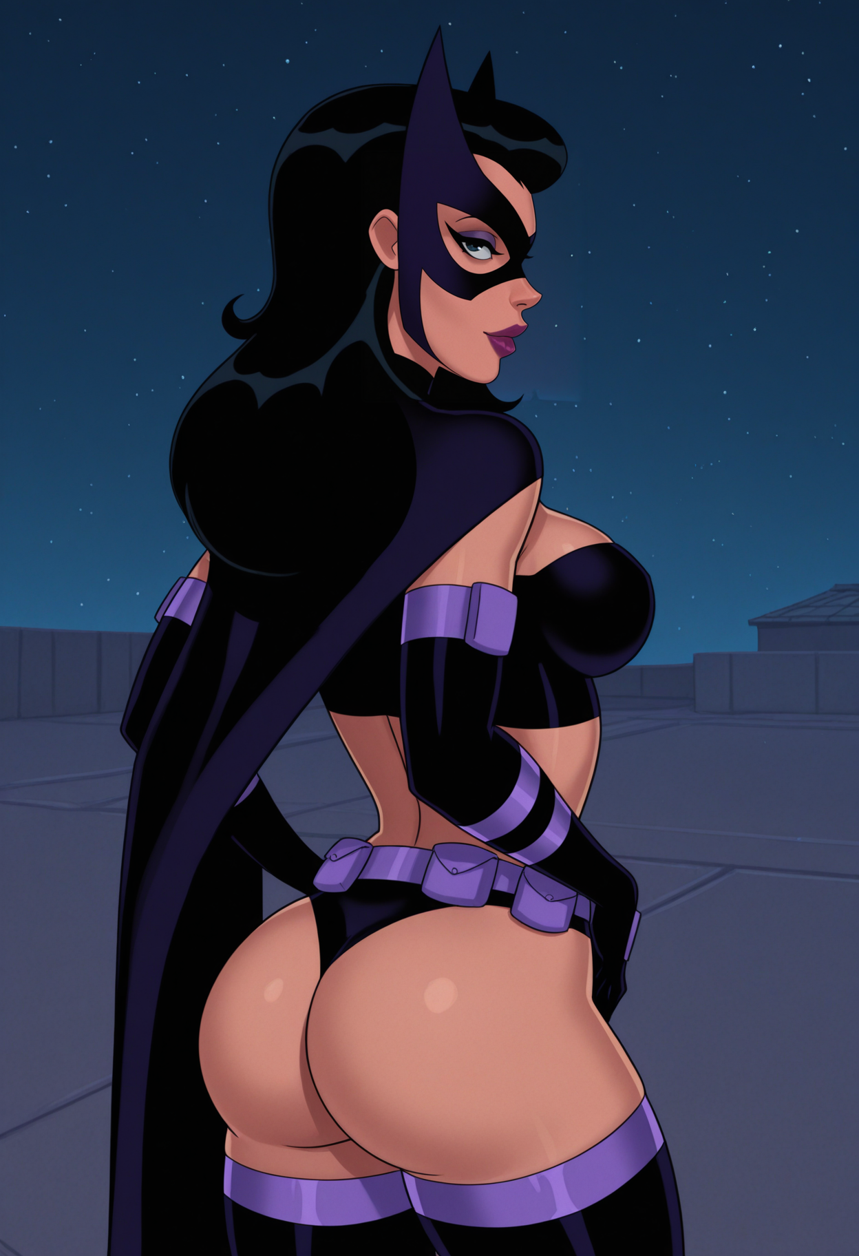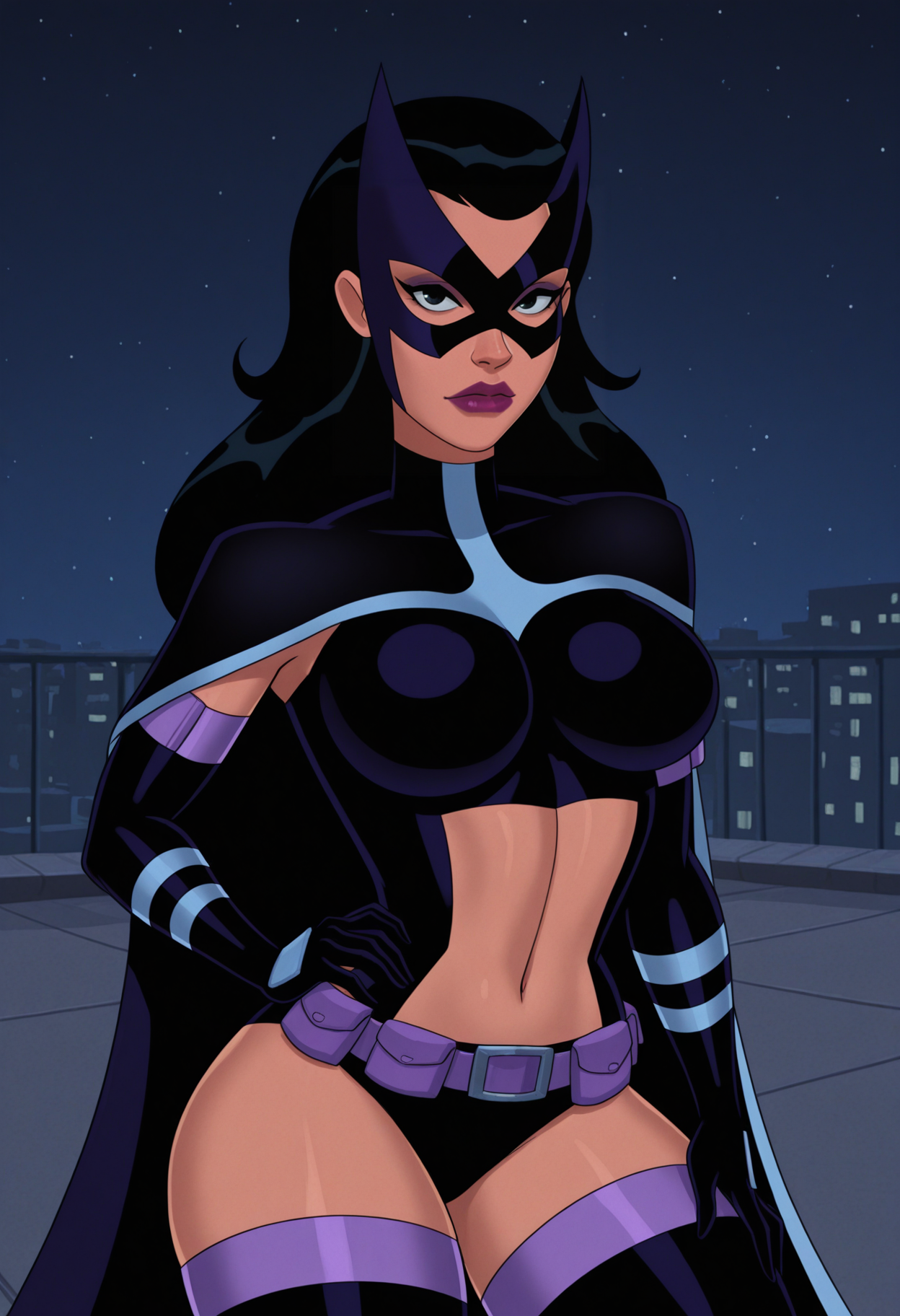hunt_main_outfit, superhero, mask, domino mask, huntress_mask, cape, midriff, navel, gloves, elbow gloves, belt, purple belt, thighhighs, black thighhighs,