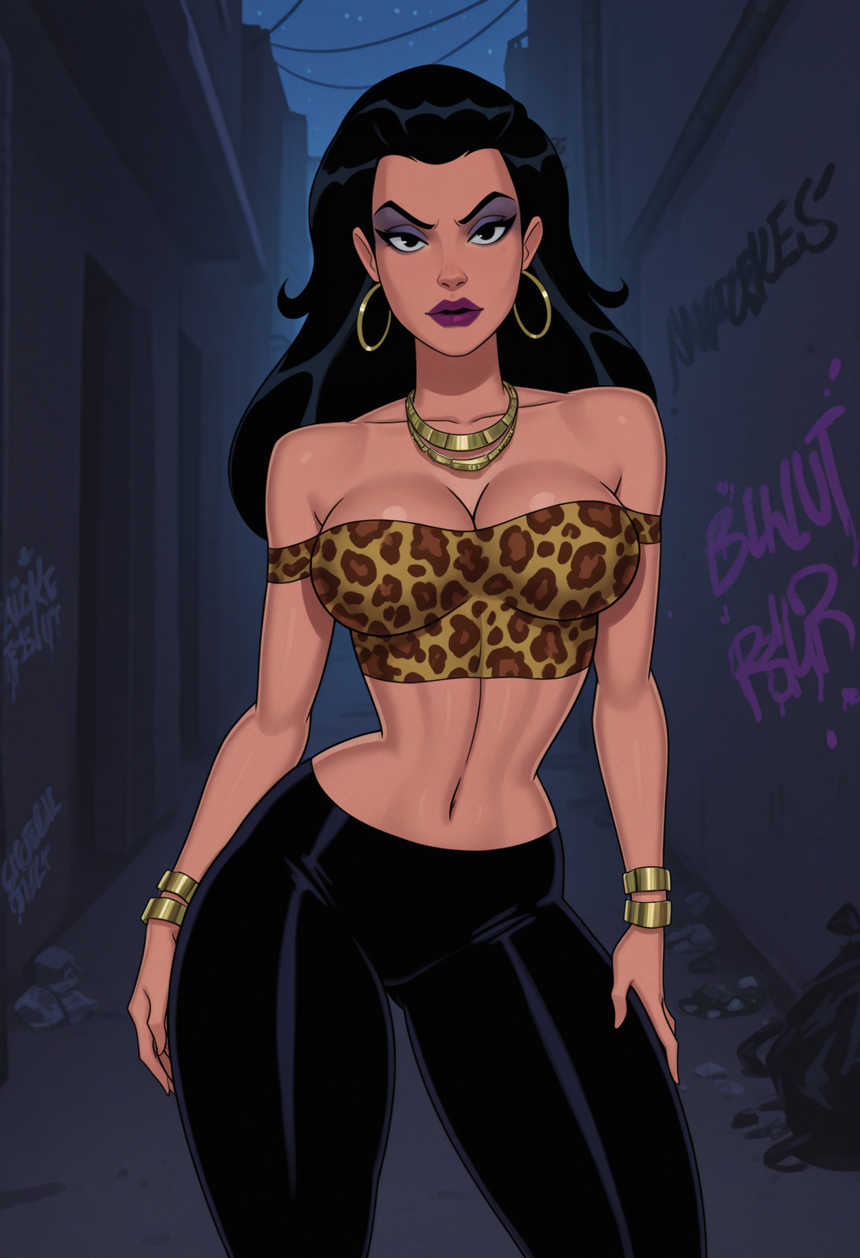hunt_slut_outfit, jewelry, earrings, hoop earrings, necklace, bracelet, bare shoulders, collarbone, tight clothes, crop top, animal print, leopard print, cleavage, midriff, navel, pants, black pants, tight pants,