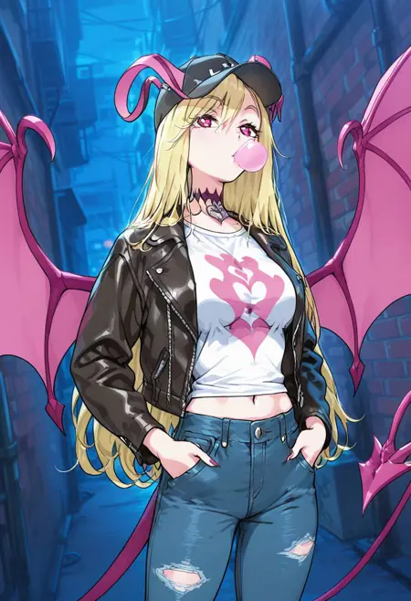 long hair, blonde hair, pink eyes, horns, wings, tail, leotard, cleavage, thighhighs