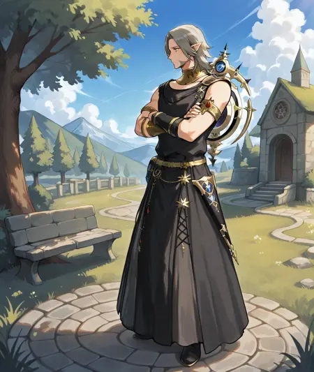 Character tags: UriangerBase, elezen, pointy ears, dark skin, yellow eyes, grey hair, medium hair, facial hair, beard, jewelry, gold choker, red gemstone, collarbone, black robe, gold trim, sleeveless, asymmetrical armwear, bracer, bracelet, ring, gold belt, gold chains, black footwear,