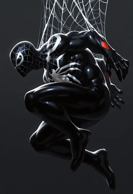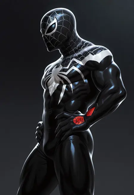 superior_blacknwhite(videogames)XL, symbiote, black suit, bodysuit, 1boy, solo, mask, spider print, white print, muscular, black lenses, white lenses,