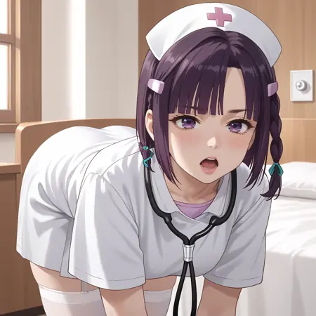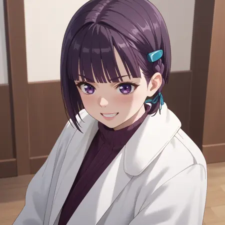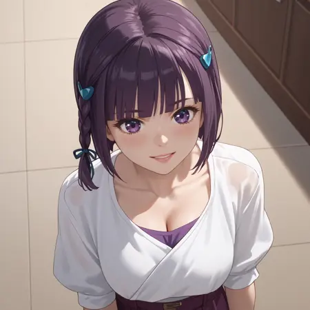 ATNMafuyu, purple eyes, short hair, bangs, purple hair, braid, eyebrows visible through hair, blunt bangs, long hair,