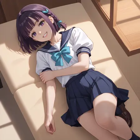 MafuyuSchool, school uniform, serafuku, ribbon, shirt, hair ribbon, sailor collar, short sleeves, blue skirt, neckerchief, pleated skirt, puffy sleeves, skirt,