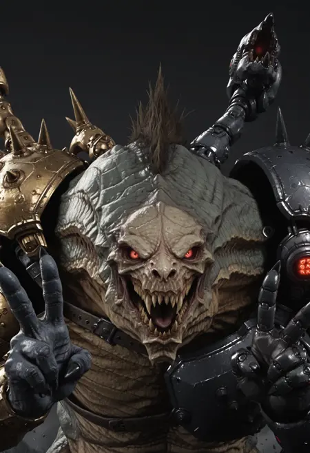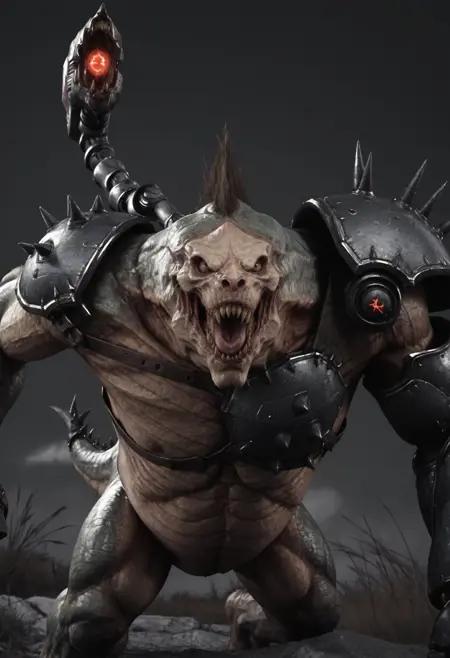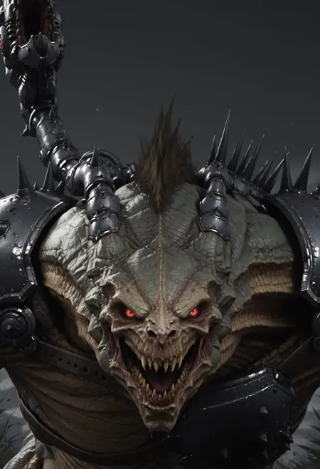 kdoilf、アーマー、モンスター、鋭い歯、片方の機械的な腕、チェーンソー、尾