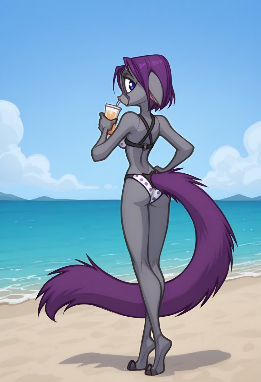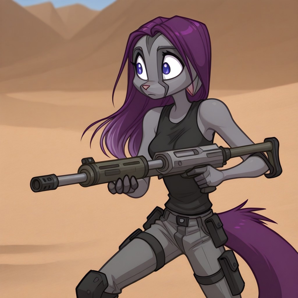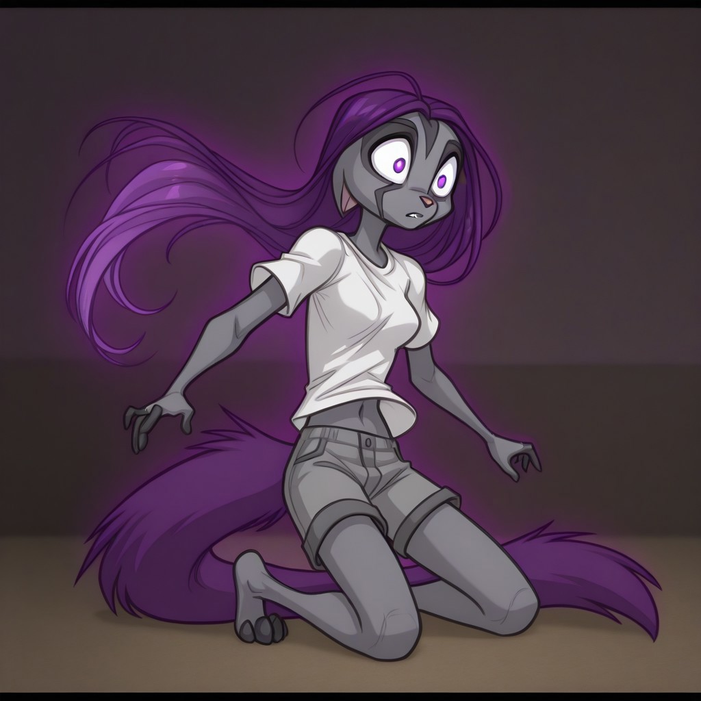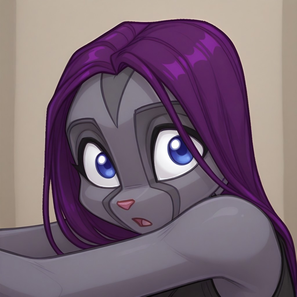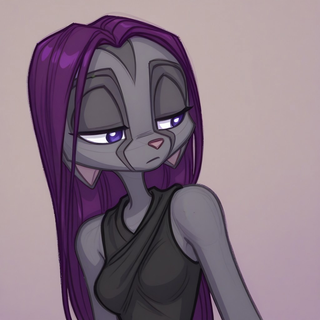 kalei: kalei, 1girl, furry, furry female, blue eyes, animal nose, purple hair, grey skin, animal ears, tail,