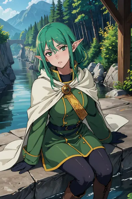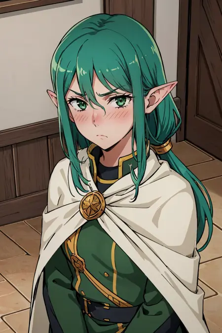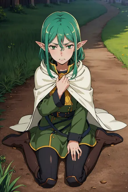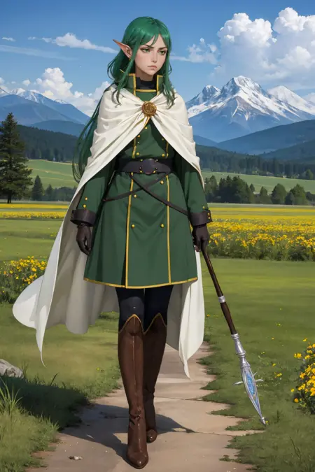 • 그녀의 대표적인 외모를 표현하려면 "보석, 흰 외투, 녹색 드레스, 긴 녹색 소매, 장갑, 벨트, 팬티스타킹"을 추가하세요.