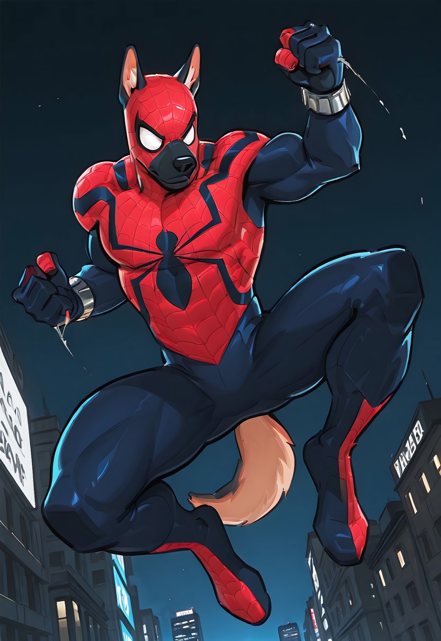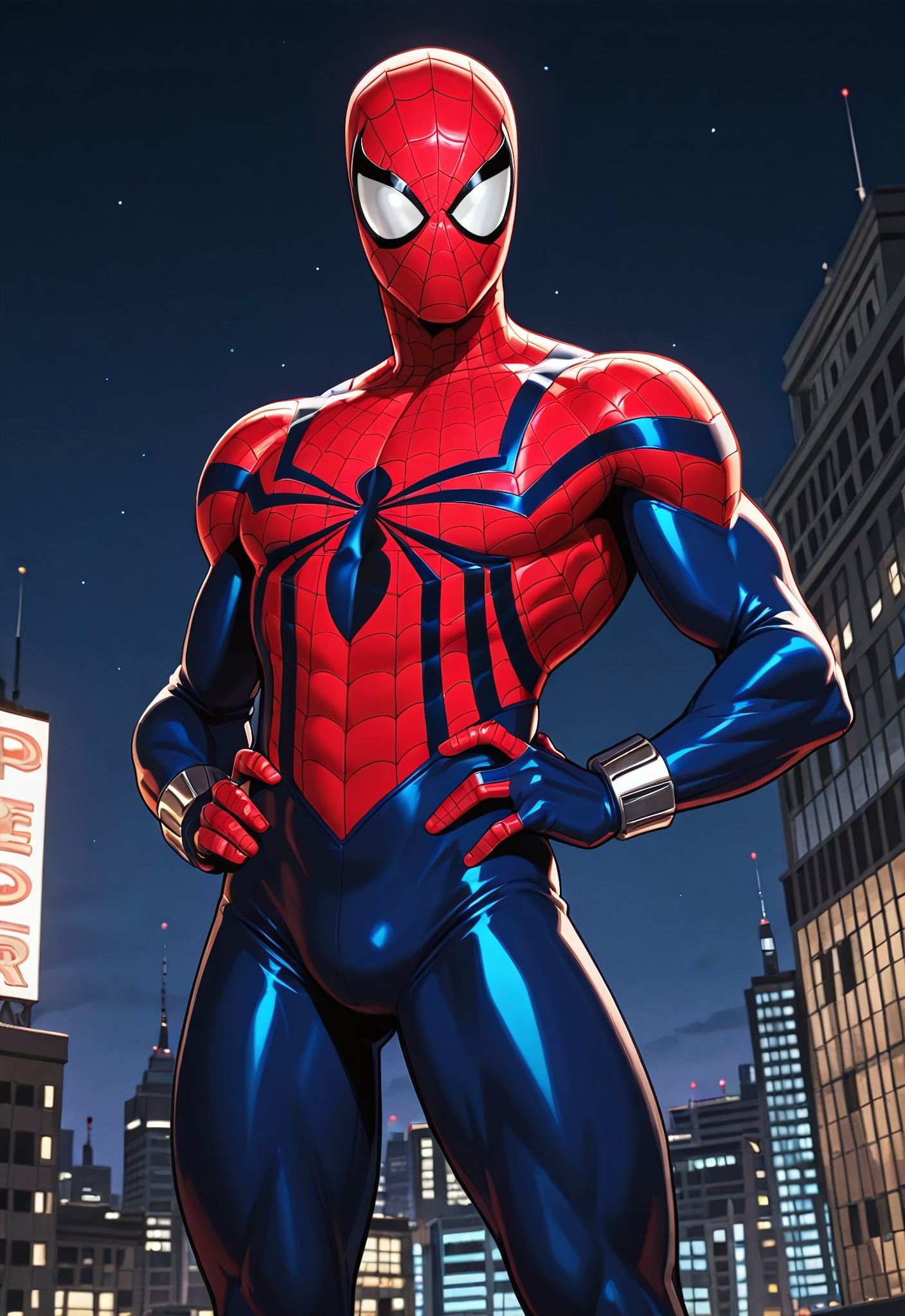 sensaiospider_benreilly_(videogames)IL, bodysuit, rednblue suit, spider print, black print, muscular, mask, 1boy, solo,
