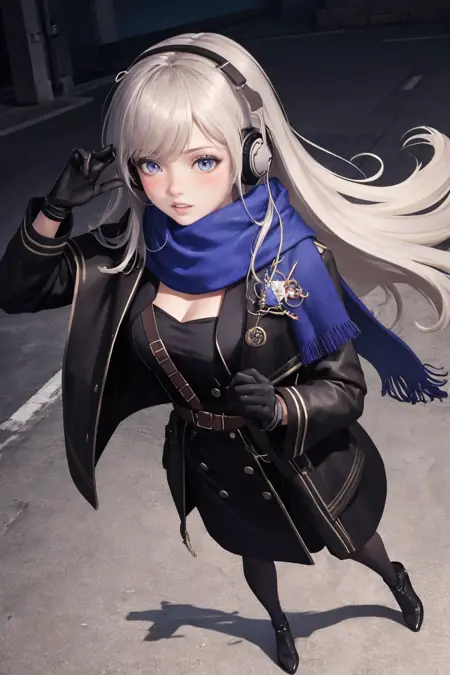 bkornblume, headphones, blue scarf, coat, black dress, black gloves