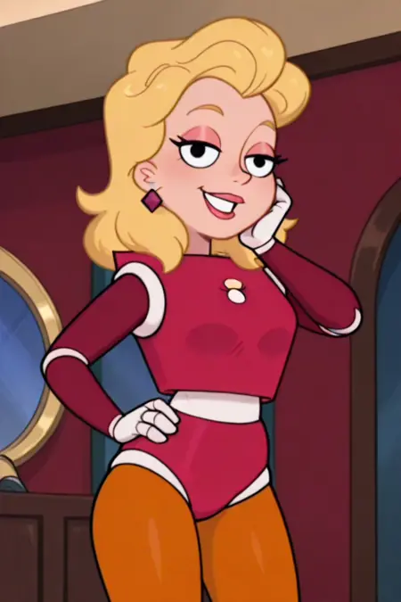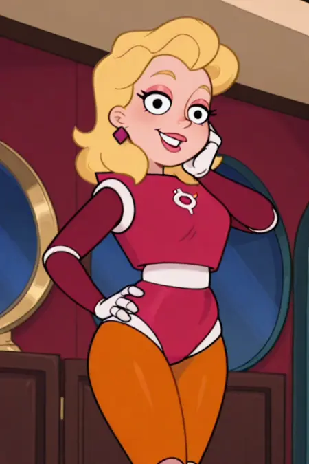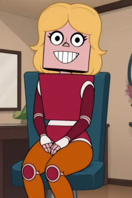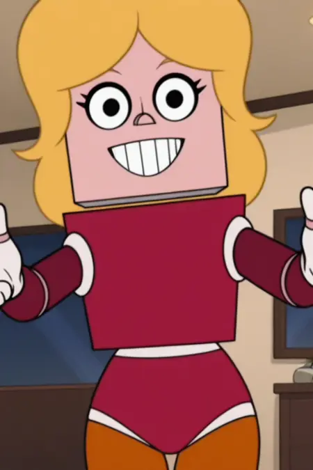 로봇 복장, 기계화된, 사이보그 같은 형태, 날씬한 모래시계 실루엣과 뚜렷한 곡선, 블록 모양의 두개골, 넓게 떨어진 눈에 진한 속눈썹, 작은 코, 광대한 고정된 미소, 사각형의 하얀 이빨, 볼륨감 있는 황금빛 머리카락, 곱슬진 보브 스타일,