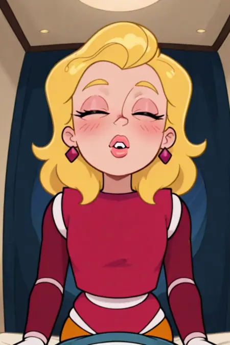 하얀 피부, 파란색 아몬드 모양의 눈, 곡선을 이룬 눈썹, 메이크업, 부드러운 톤으로 물든 두꺼운 입술, 부드럽게 곱슬진 어깨 길이의 황금색 머리카락, 루비 톤의 매달린 귀걸이,