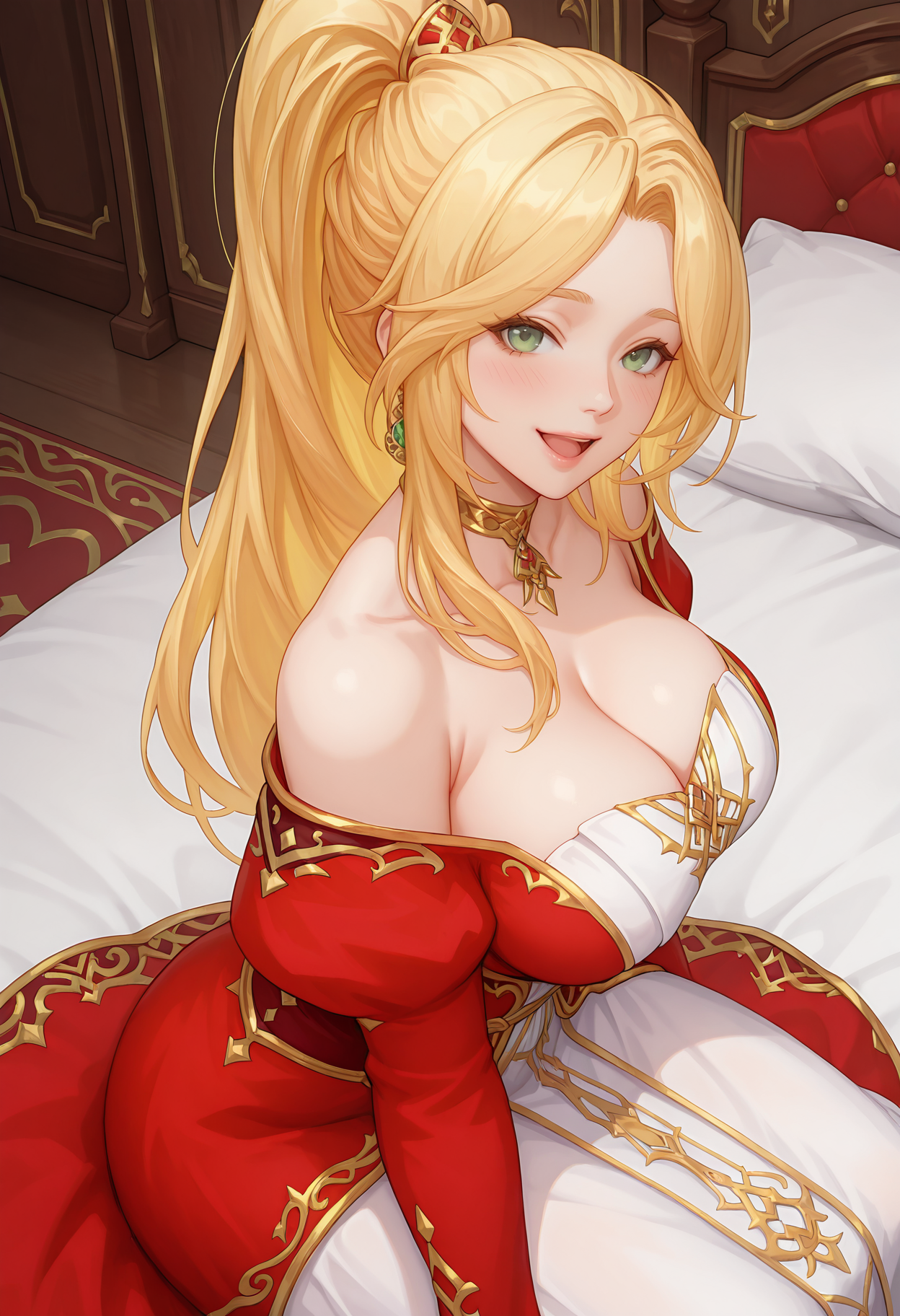 wogneste、金髪、ロングヘア、緑の目、ヘアタイ、高いポニーテール、分け目のある前髪、片耳のイヤリング、