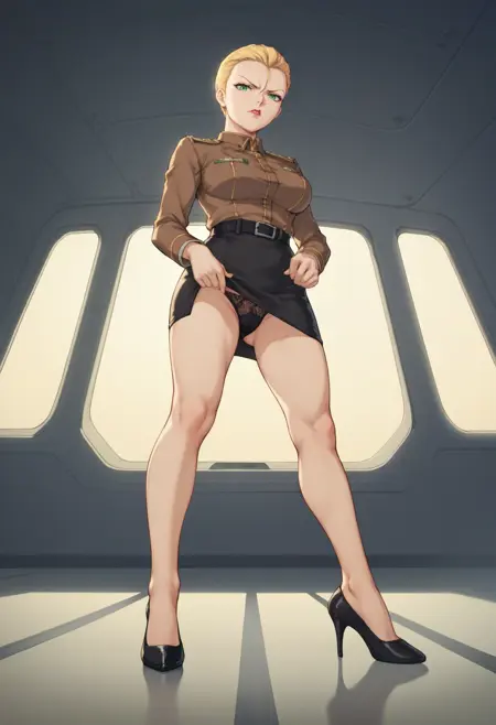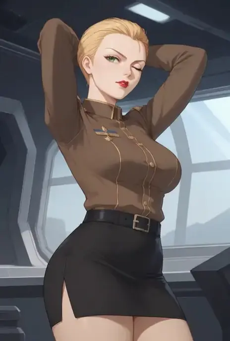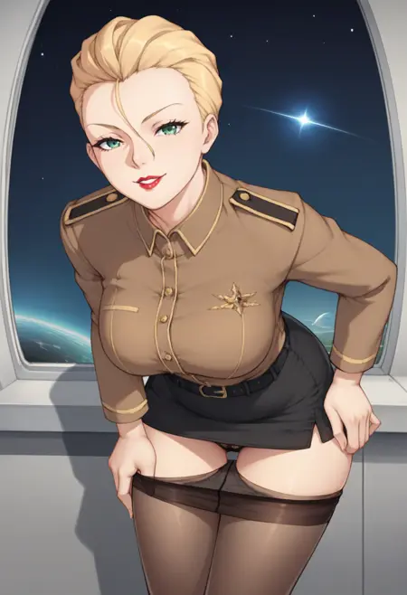 Appearance: MSGSF91LydiaDorfman, 1girl, blonde hair, green eyes, red lips, short hair, hair slicked back, lipstick, parted lips, makeup, forehead, hair between eyes, breasts, aged up,