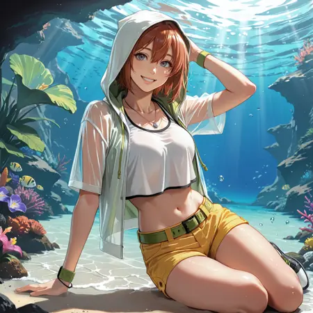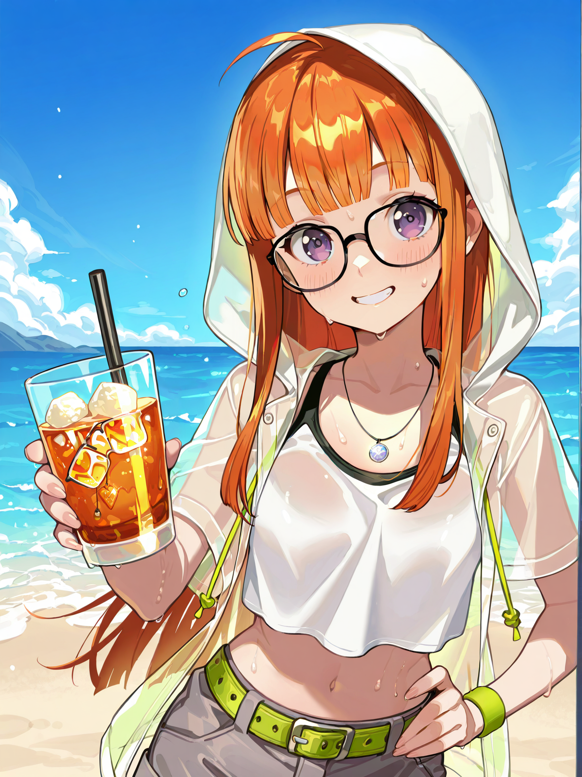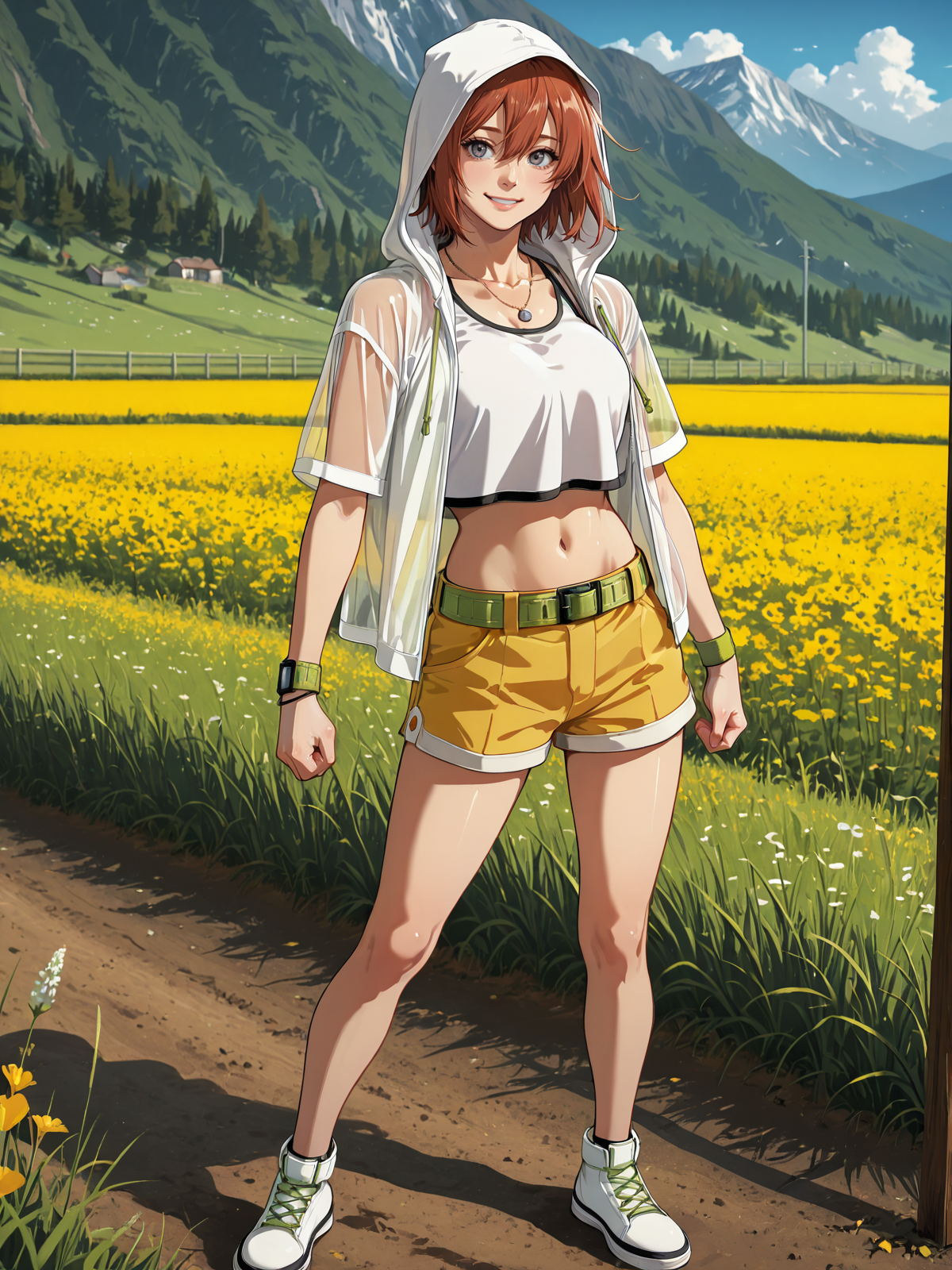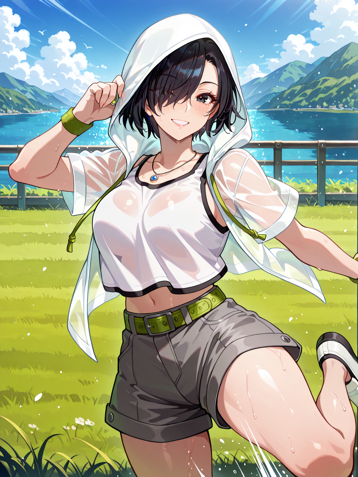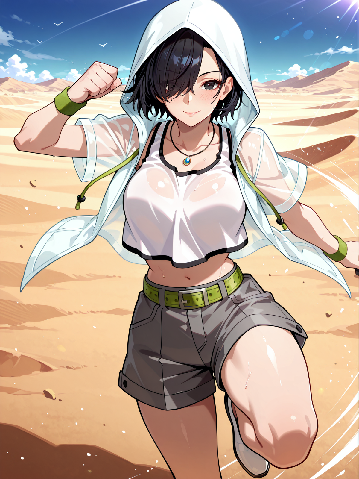 swss_female, white see-through jacket, Drawstrings, Hooded Jacket, Cropped Tank Top, white tank top with black trim, navel, gray shorts, green belt, Slip-on shoes, white slip-on shoes, green wristband, Pendant Necklace,
