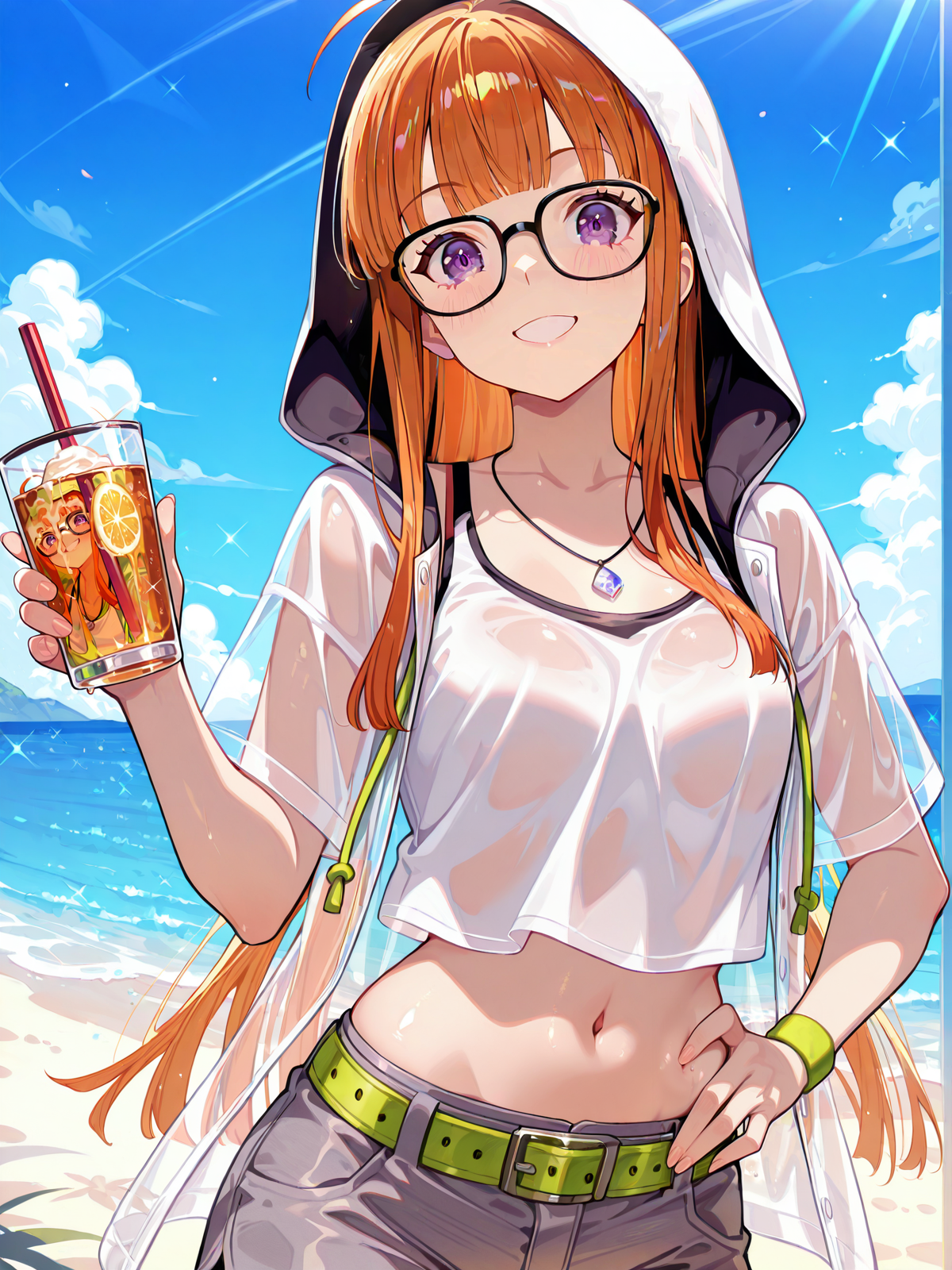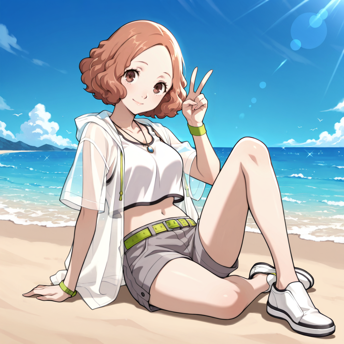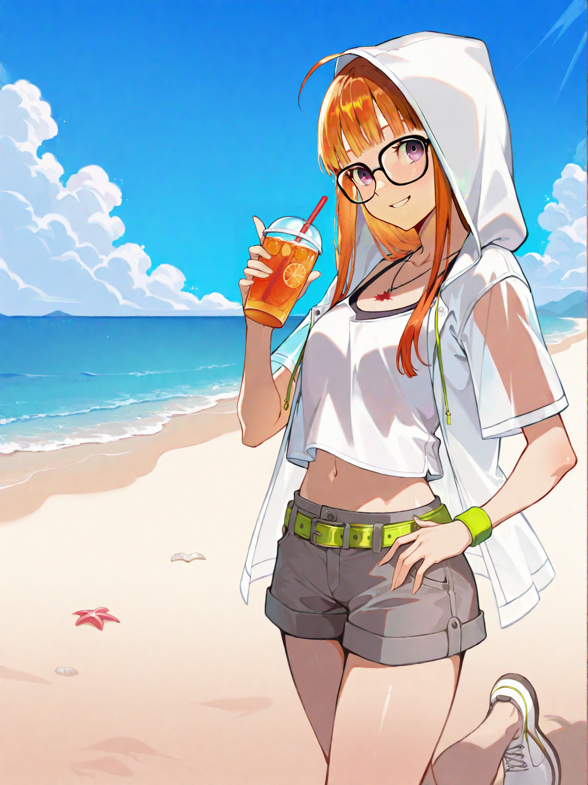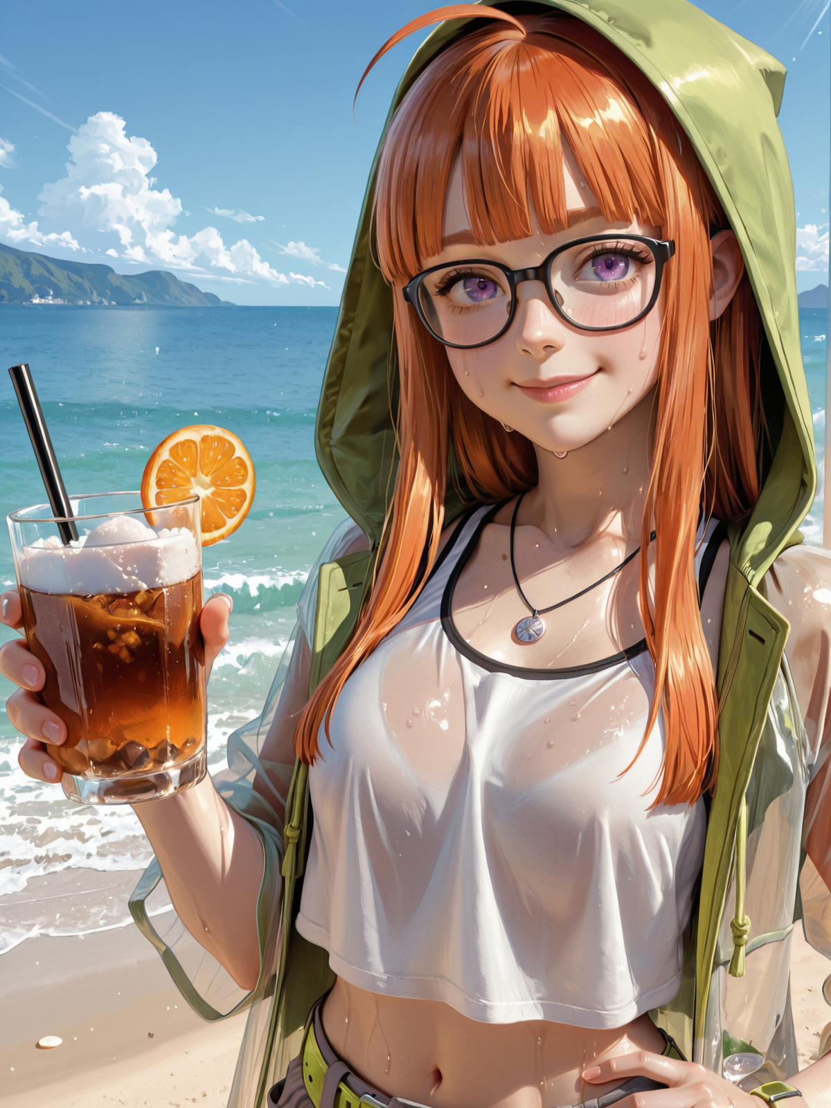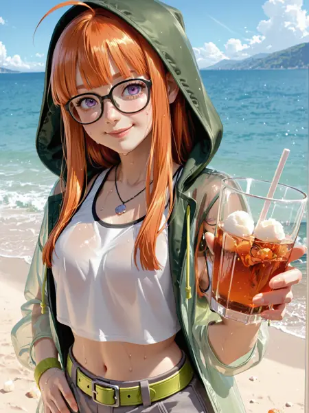 swss_female, white see-through jacket, Drawstrings, Hooded Jacket, Cropped Tank Top, white tank top with black trim, navel, gray shorts, green belt, Slip-on shoes, white slip-on shoes, green wristband, Pendant Necklace,