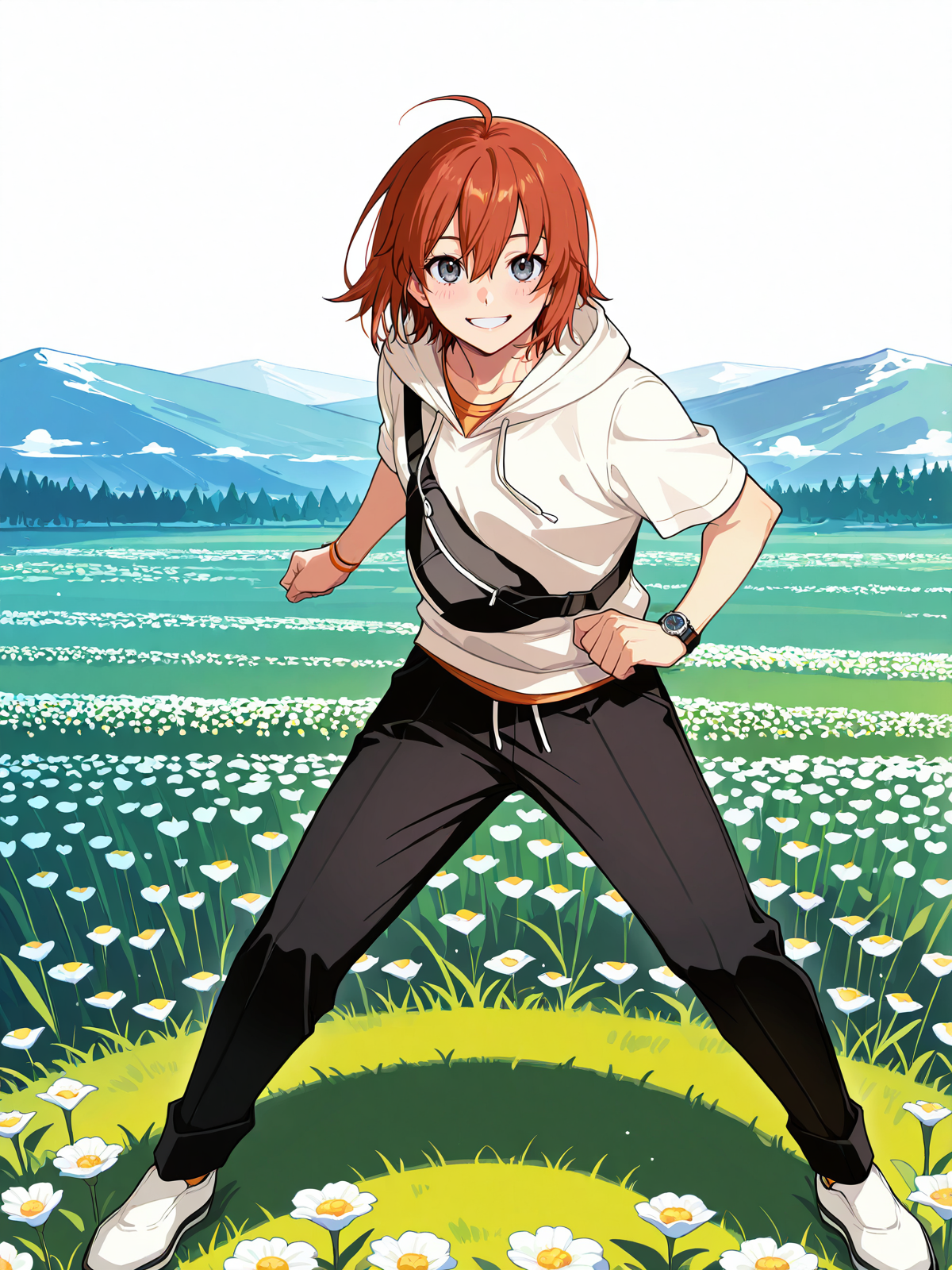swss_male, orange T-shirt, white hoodie, black Sling Bag, Cropped Wide-Leg Pants, black pants, Drawstrings, Slip-on shoes, white slip-on shoes, wristband, Wristwatch,