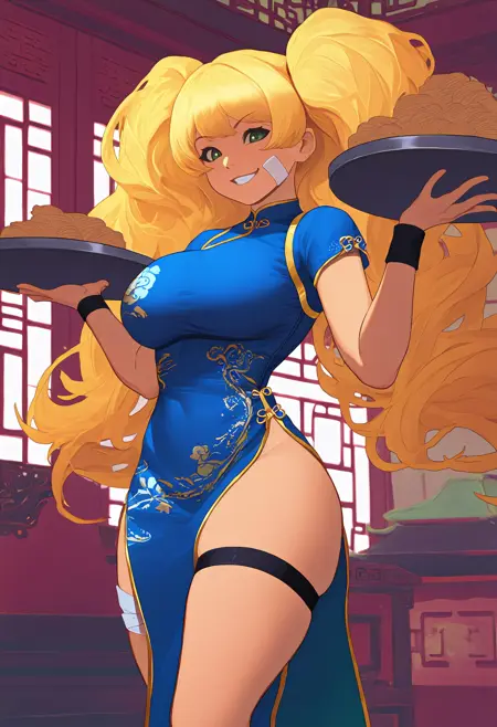 Default Outfit: mnkdef, long hair, blonde hair, twintails, black headwear, peaked cap, hat feather, green eyes, black coat, high collar, open coat, long sleeves, wide sleeves, blue armband, white shirt, untucked shirt, red ascot, white gloves, bridal gauntlets, blue skirt, pleated skirt, miniskirt, red thighhighs, bandaid on cheek, large breasts
