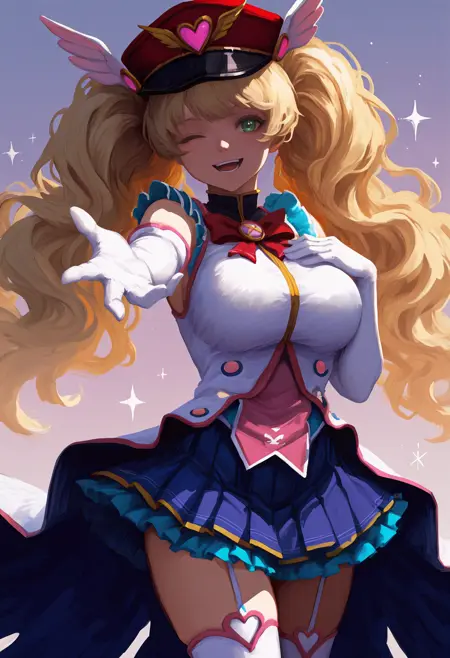 Summer: mnkvalentine, magical girl, long hair, blonde hair, wavy hair, twintails, red headwear, winged hat, peaked cap, green eyes, frills, white jacket, turtleneck jacket, sleeveless jacket, red bowtie, brooch, white gloves, elbow gloves, blue skirt, pleated skirt, frilled skirt, white thighhighs, garter straps, large breasts