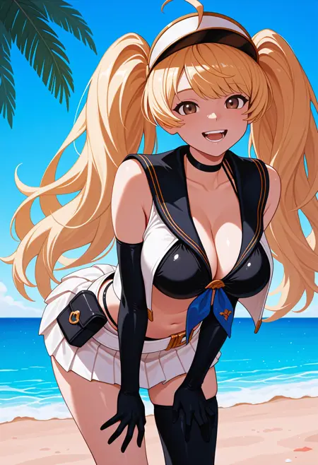 Valentine: mnksummer, long hair, blonde hair, ahoge, twintails, white headwear, visor cap, brown eyes, black choker, white vest, open vest, black sailor collar, blue neckerchief, black bikini, black gloves, elbow gloves, white skirt, pleated skirt, miniskirt, white belt, loose belt, belt pouch, black thighhighs, single thighhigh, bare shoulders, navel, cleavage, large breasts