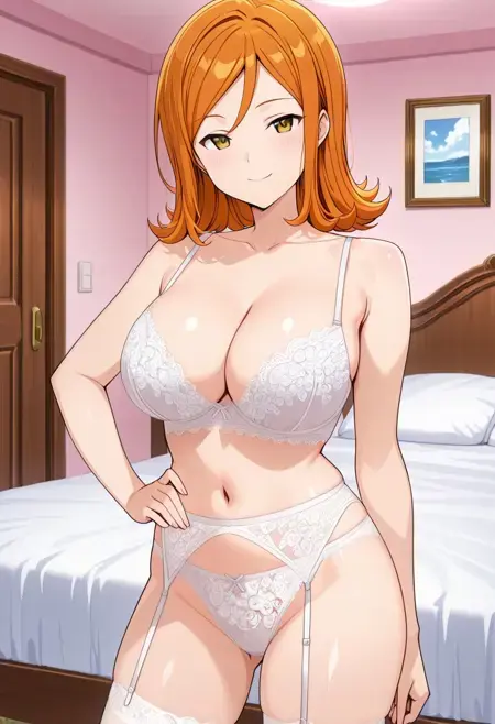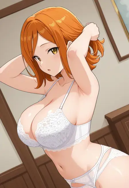 RingoLingerie, 1girl, solo, mature female, long hair, orange hair, golden-brown eyes, large breasts, curvy, large hips, shiny skin, smoothy skin, collarbone, whie bra, white panties, cleavage, thighhighs, navel, white garter belt, white straps, white thighhighs, white lingerie, lace-trimmed bra, lace panties, bare shoulders, barefoot,