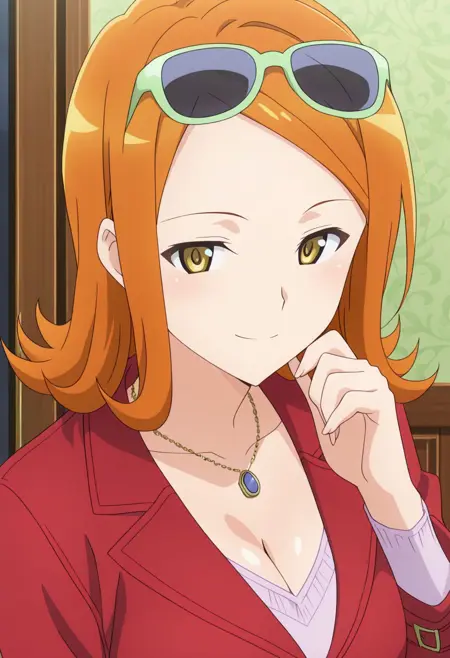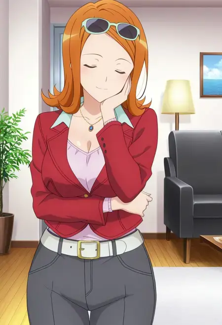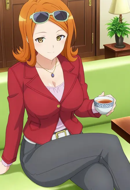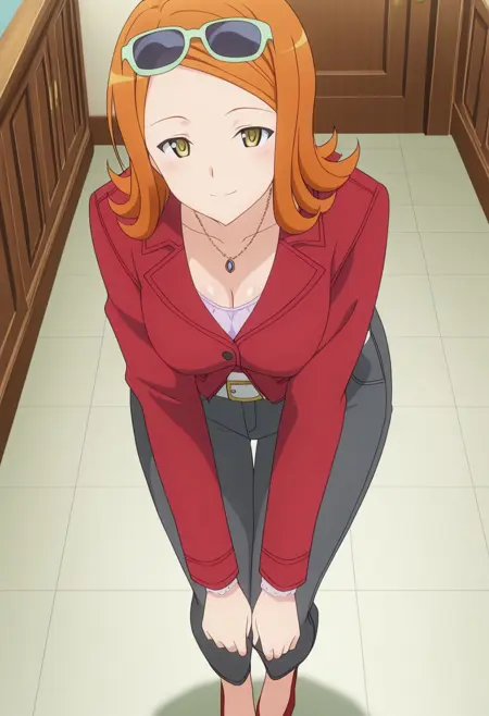 RingoYuuki, 1girl, solo, mature female, long hair, orange hair, golden-brown eyes, large breasts, curvy, large hips, shiny skin, smoothy skin, eyewear on head, sunglasses, jewelry, necklace, collarbone, red jacket, long sleeves, grey pants, belt, buckle, red shoes, medium heels,