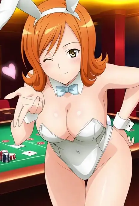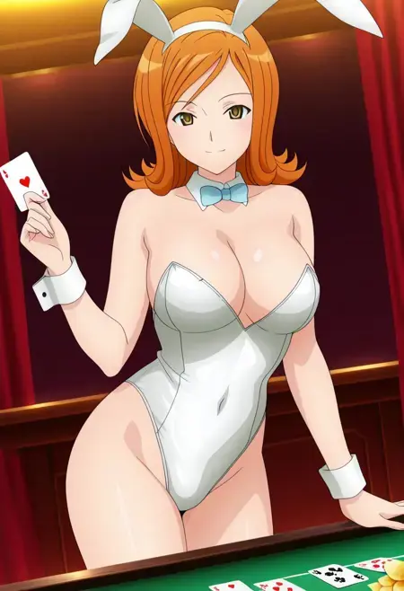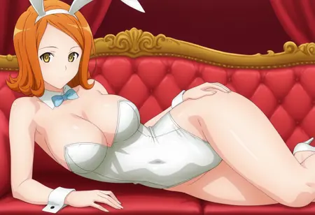 RingoBunny, 1girl, solo, mature female, long hair, orange hair, golden-brown eyes, large breasts, curvy, large hips, shiny skin, smoothy skin, fake animal ears, rabbit ears, playboy bunny, detached collar, blue bowtie, cleavage, wrist cuffs, white leotard, covered navel, bare legs, high heels, white shoes,