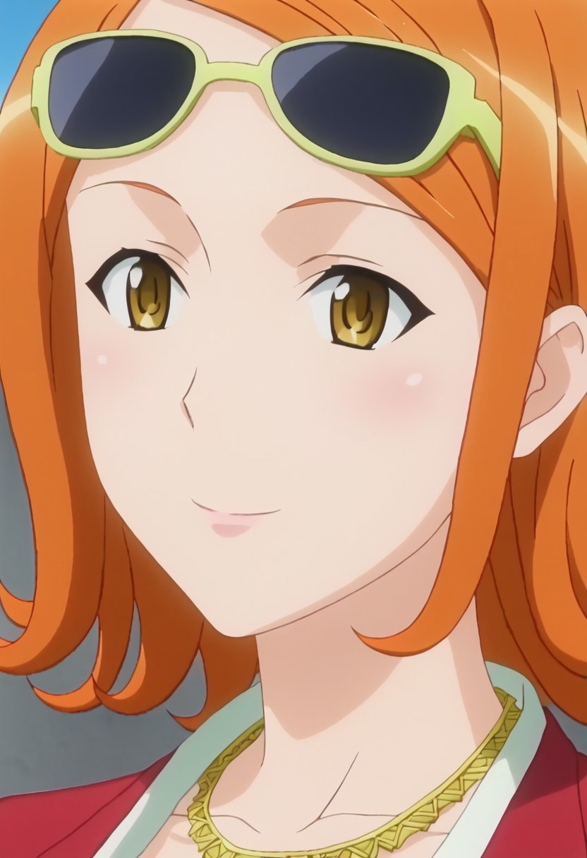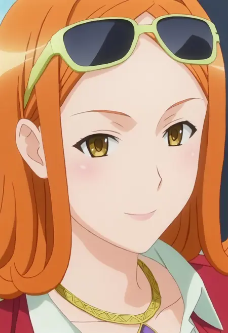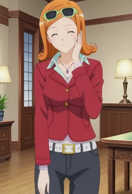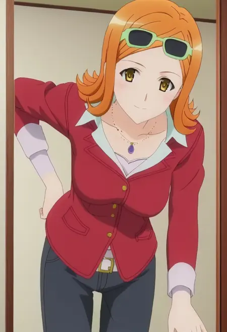 RingoYuuki, 1girl, solo, mature female, long hair, orange hair, golden-brown eyes, large breasts, curvy, large hips, shiny skin, smoothy skin, eyewear on head, sunglasses, jewelry, necklace, collarbone, red jacket, long sleeves, grey pants, belt, buckle, red shoes, medium heels,
