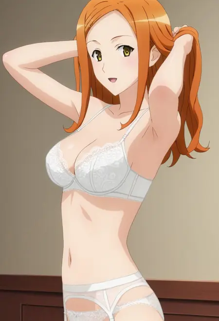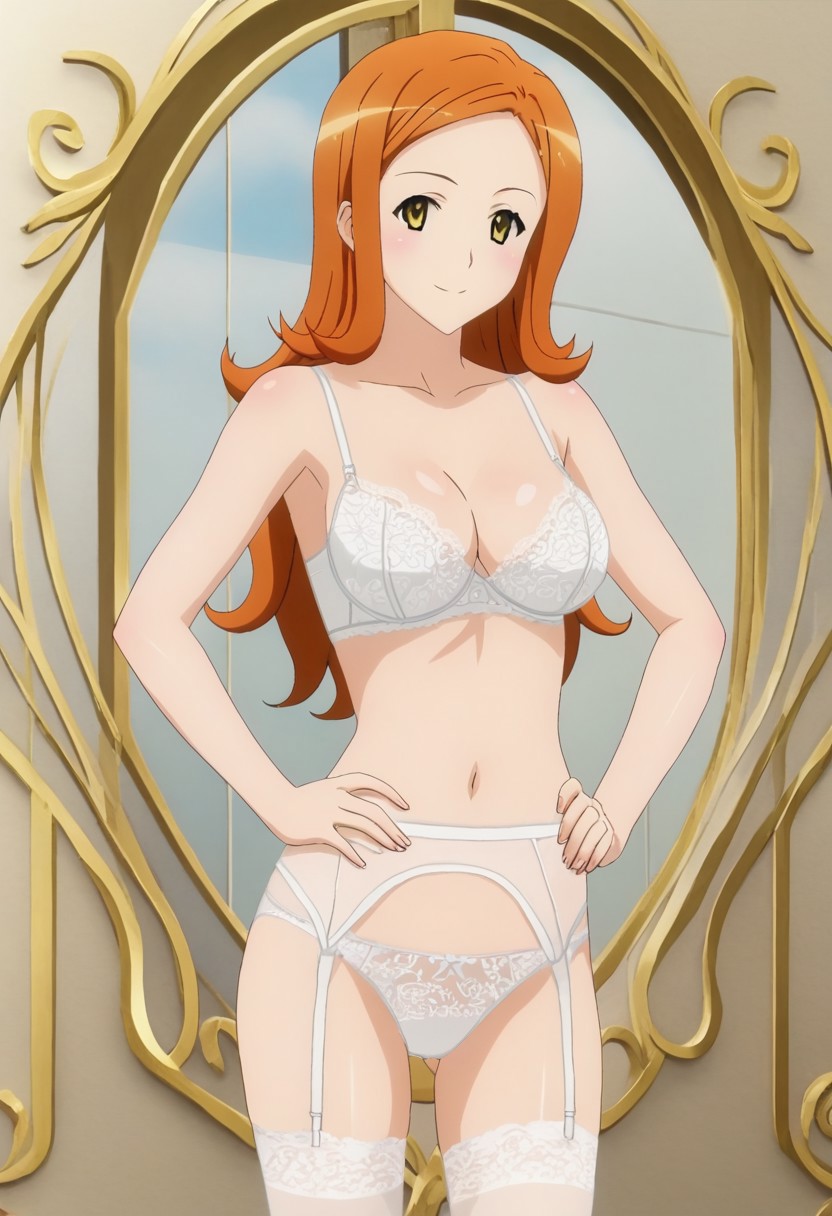 RingoLingerie, 1girl, solo, mature female, long hair, orange hair, golden-brown eyes, large breasts, curvy, large hips, shiny skin, smoothy skin, collarbone, whie bra, white panties, cleavage, thighhighs, navel, white garter belt, white straps, white thighhighs, white lingerie, lace-trimmed bra, lace panties, bare shoulders, barefoot,