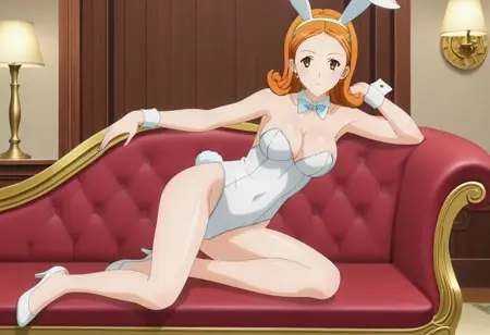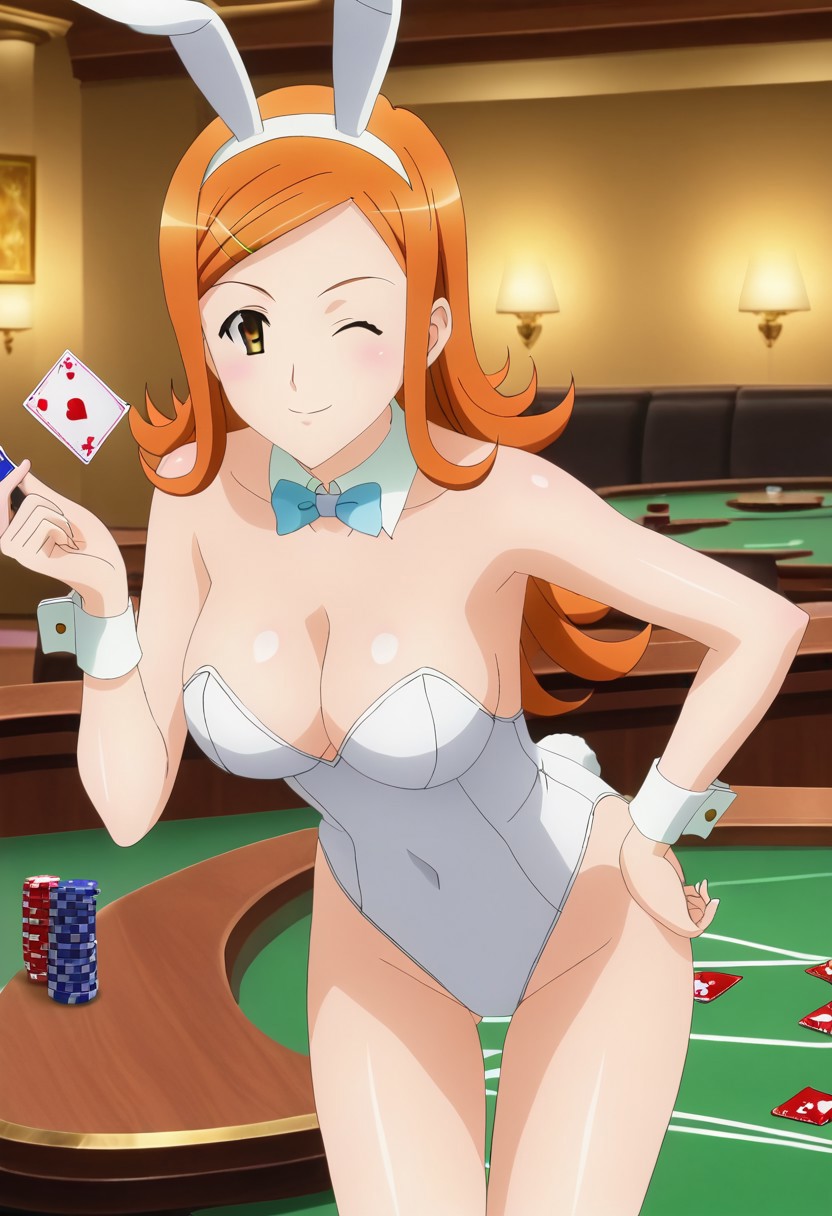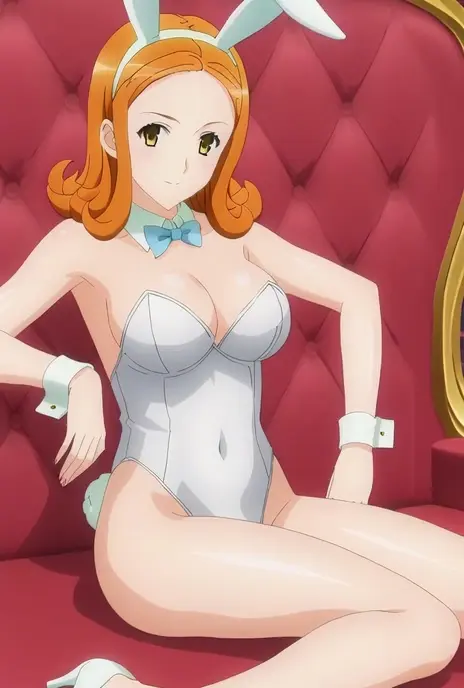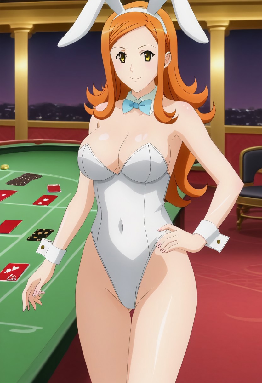 RingoBunny, 1girl, solo, mature female, long hair, orange hair, golden-brown eyes, large breasts, curvy, large hips, shiny skin, smoothy skin, fake animal ears, rabbit ears, playboy bunny, detached collar, blue bowtie, cleavage, wrist cuffs, white leotard, covered navel, bare legs, high heels, white shoes,