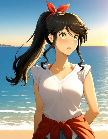 추가로 도움이 될 수 있는 태그: 녹색 눈, 포니테일, 빨간 리본, 검은 머리