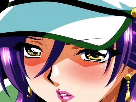Sakakibara_Kaoruko, 1girl, solo, 보라색 머리, 긴 머리, 립스틱, 메이크업, 큰 가슴, 노란 눈,