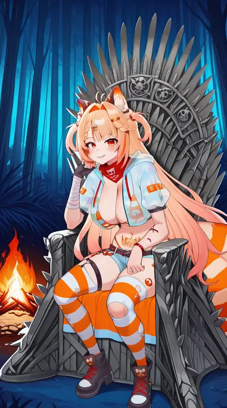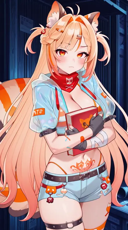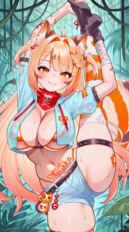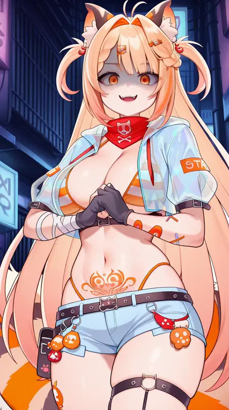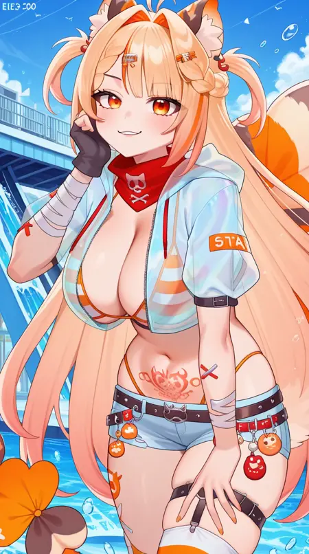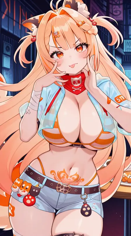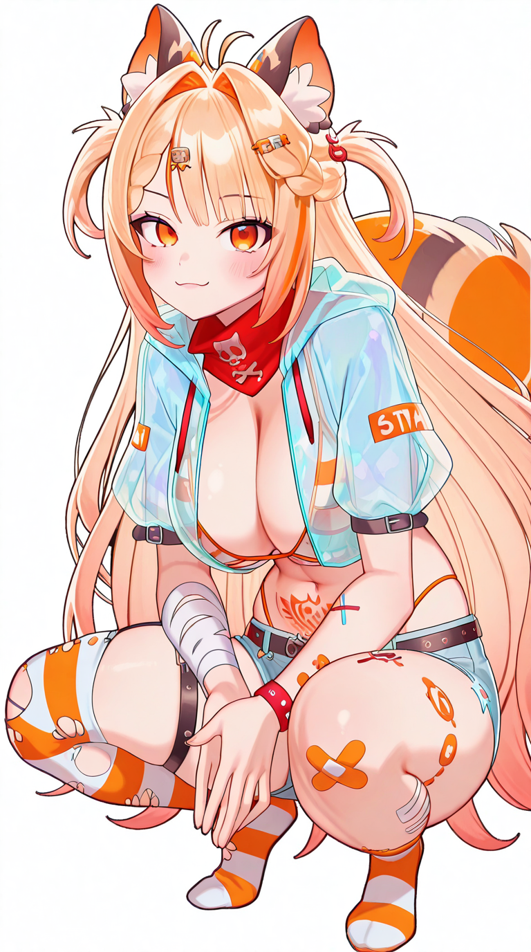 ebiko, ebiko (虚拟主播), 长发, 金发, 发饰, 动物耳朵, 极长发, 尾巴, ahoge, 虚拟YouTuber, 发夹, 橙色头发, 动物耳绒毛, 两侧向上, 橙色眼睛, 纹身, 阴部纹身, 成熟女性, 大乳房,