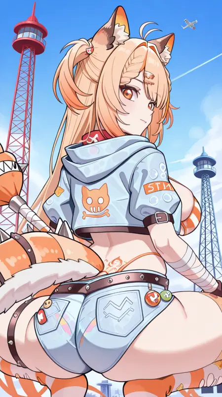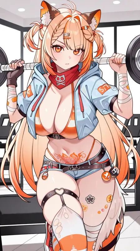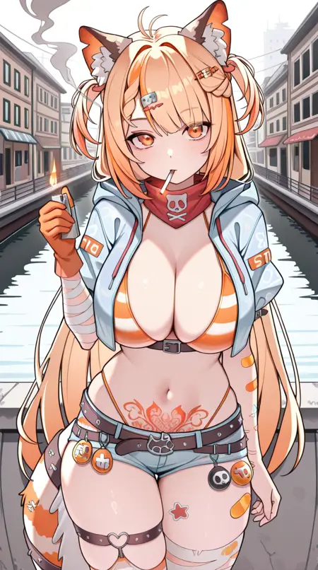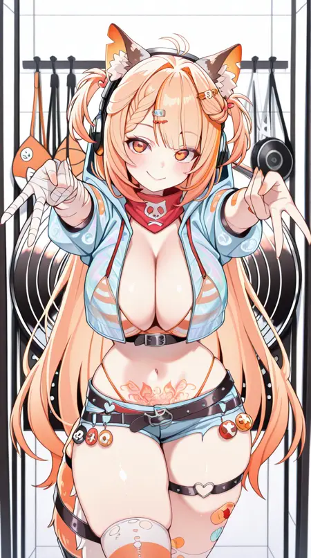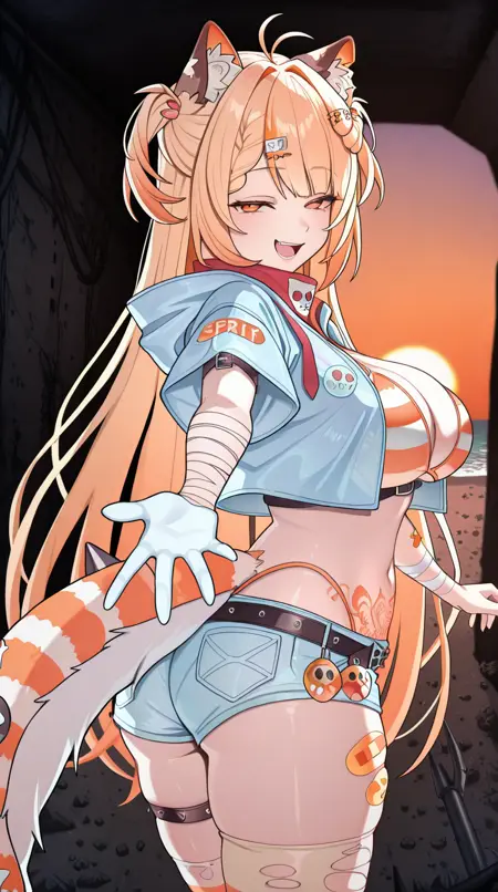 ebiko, ebiko (vtuber), long hair, blonde hair, hair ornament, animal ears, very long hair, tail, ahoge, virtual youtuber, hairclip, orange hair, animal ear fluff, two side up, orange eyes, tattoo, pubic tattoo, mature female, large breasts,
