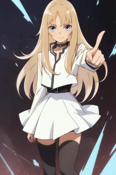 uniform: 1girl, solo, long hair, looking at viewer, blue eyes, blonde hair, long sleeves, choker, white skirt, thighhighs, black thighhighs, white uniform